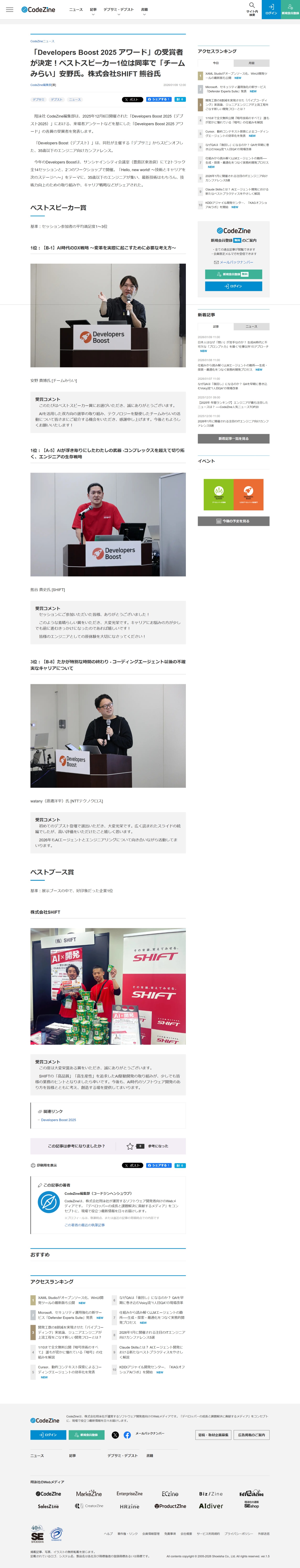 「Developers Boost 2025 アワード」の受賞者が決定!ベストスピーカー1位は同率で「チームみらい」安野氏。株式会社SHIFT 熊谷氏|CodeZine(コードジン)