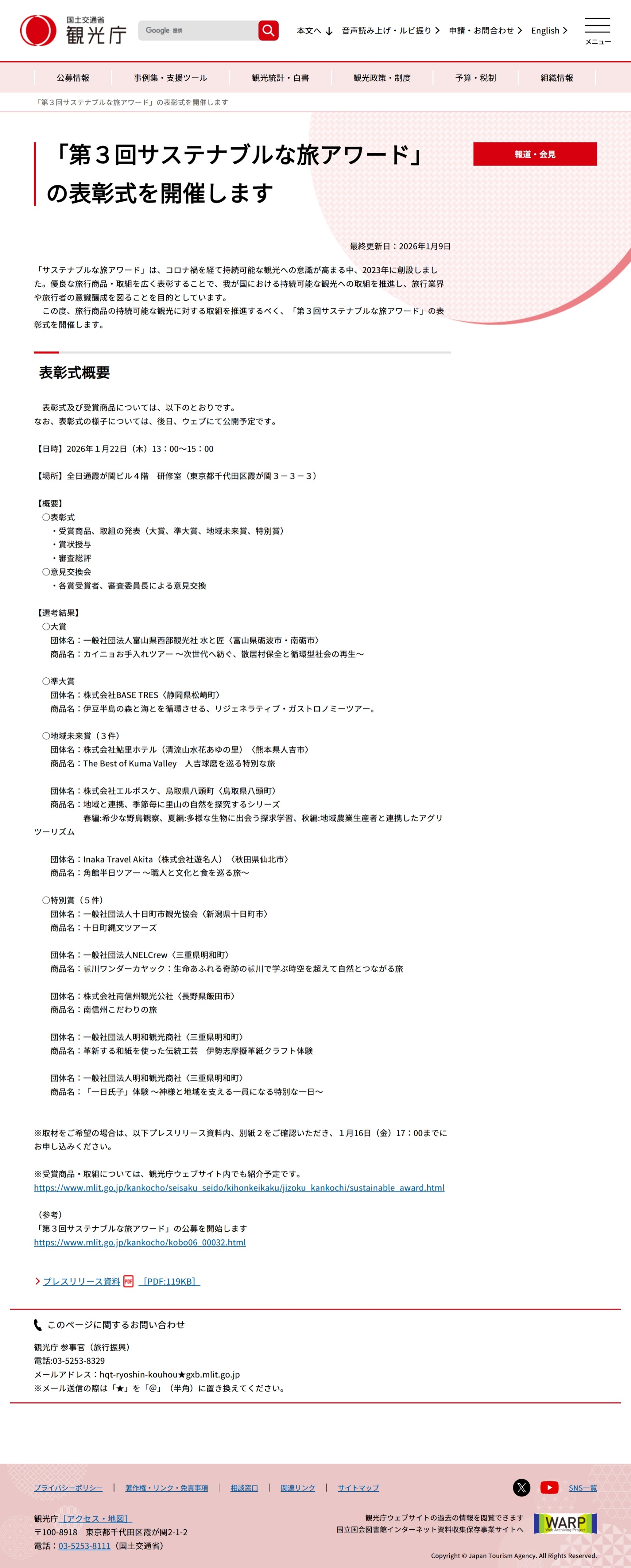 「第3回サステナブルな旅アワード」の表彰式を開催します ~持続可能な観光を推進する旅行商品・取組を表彰~