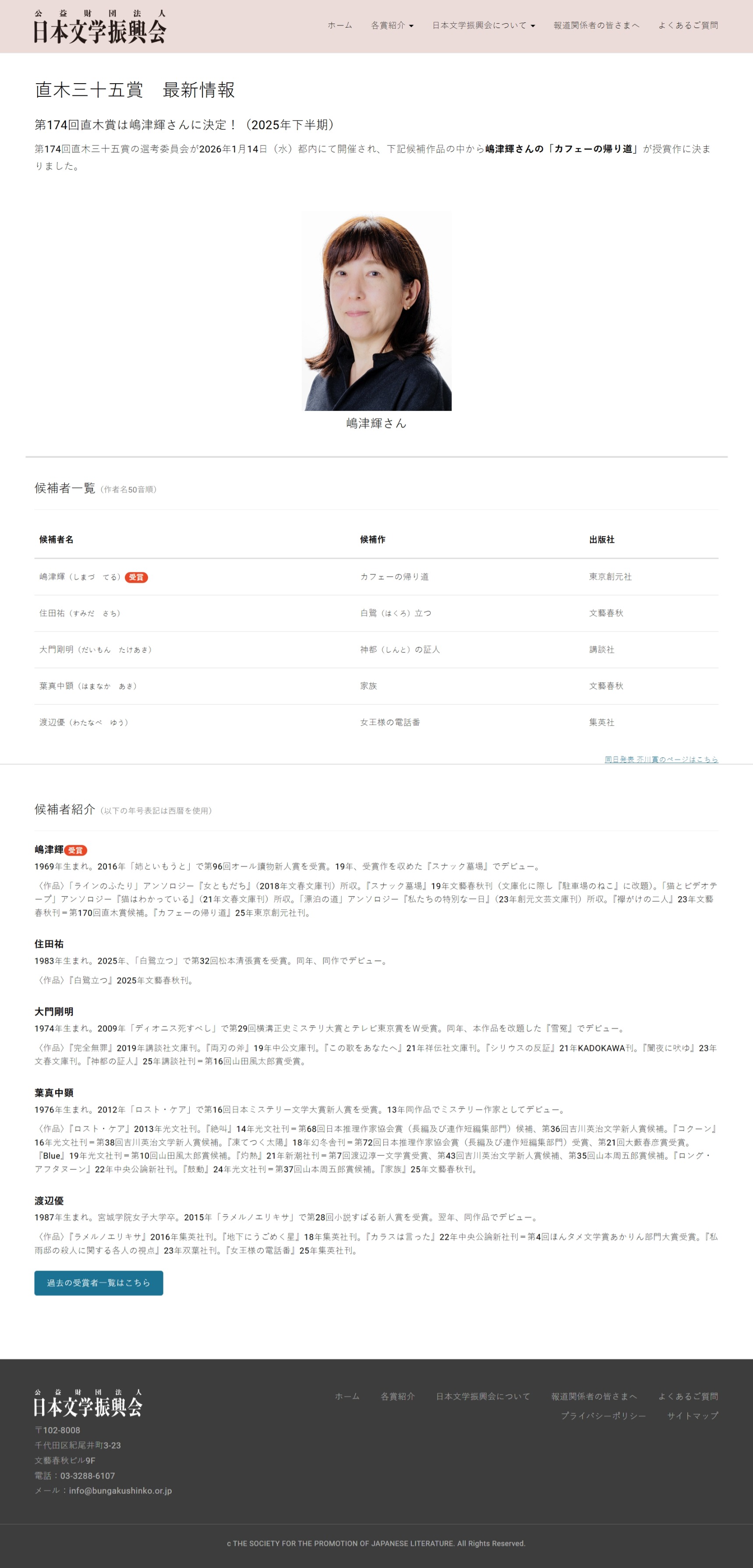 第174回直木賞は嶋津輝さんに決定!(2025年下半期)直木三十五賞|公益財団法人日本文学振興会