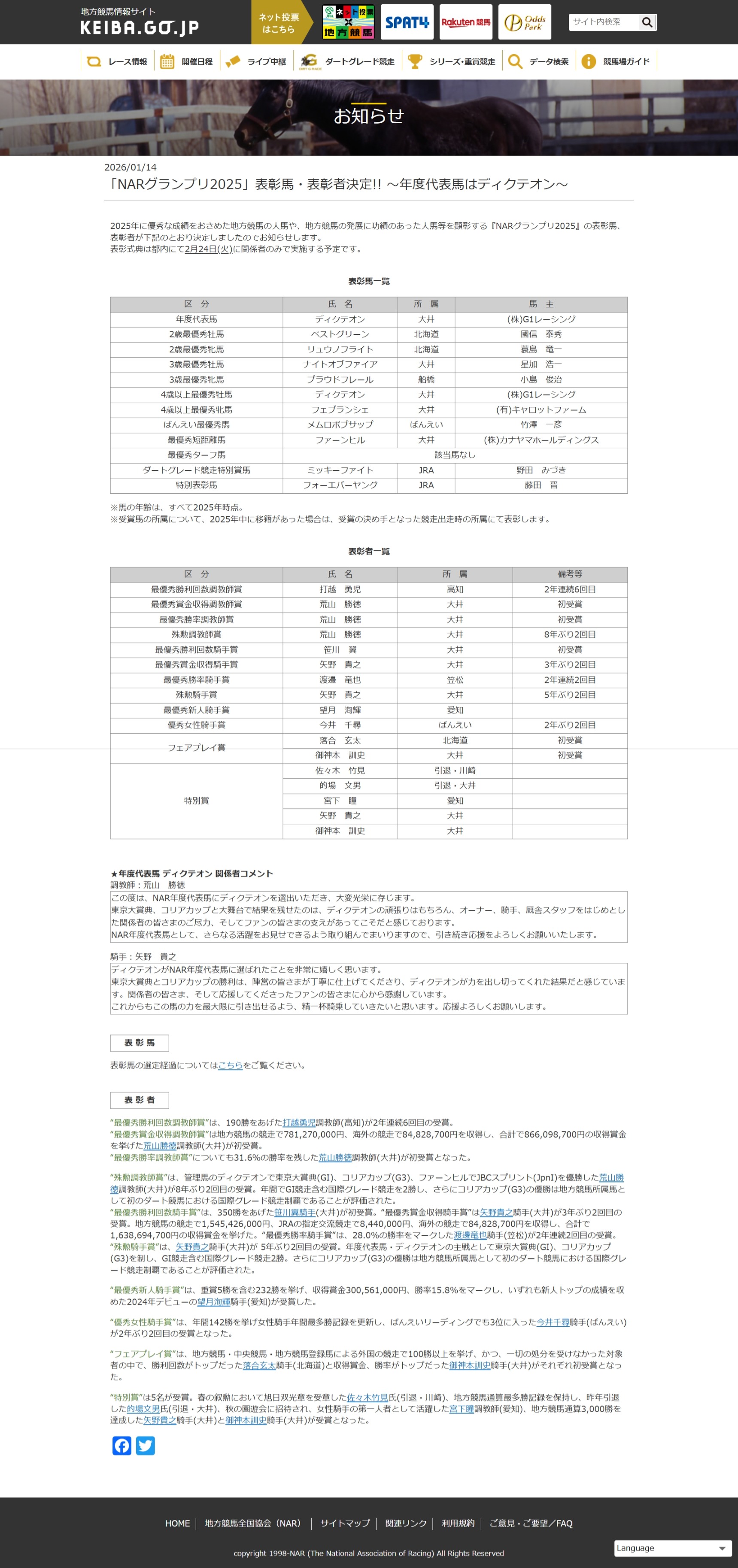 「NARグランプリ2025」表彰馬・表彰者決定!! ~年度代表馬はディクテオン~