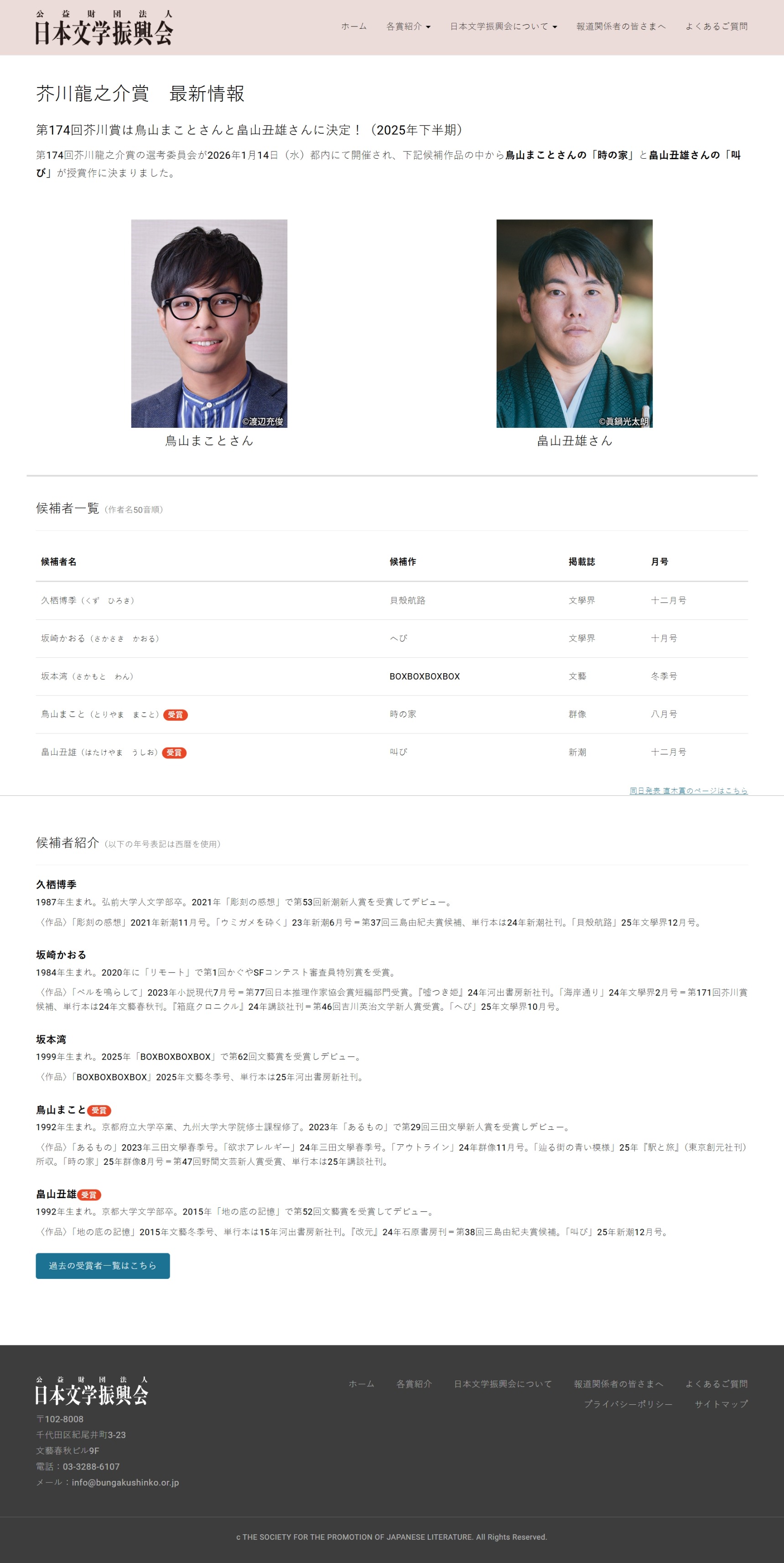 第174回芥川賞は鳥山まことさんと畠山丑雄さんに決定!(2025年下半期)第174回芥川賞は鳥山まことさんと畠山丑雄さんに決定!(2025年下半期)芥川龍之介賞|公益財団法人日本文学振興会