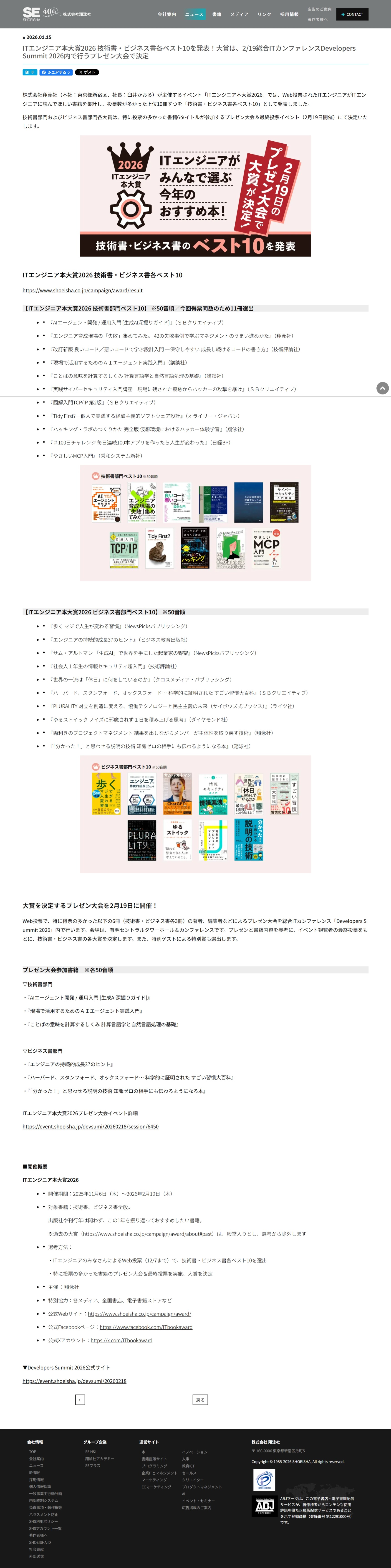 ITエンジニア本大賞2026 技術書・ビジネス書各ベスト10を発表!大賞は、2/19総合ITカンファレンスDevelopers Summit 2026内で行うプレゼン大会で決定 | 翔泳社