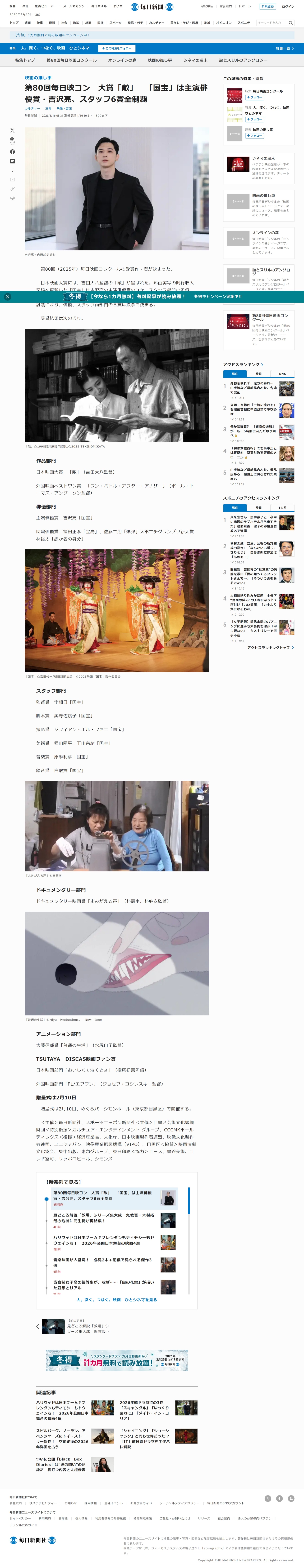 映画の推し事:第80回毎日映コン 大賞「敵」 「国宝」は主演俳優賞・吉沢亮、スタッフ6賞全制覇 | 毎日新聞