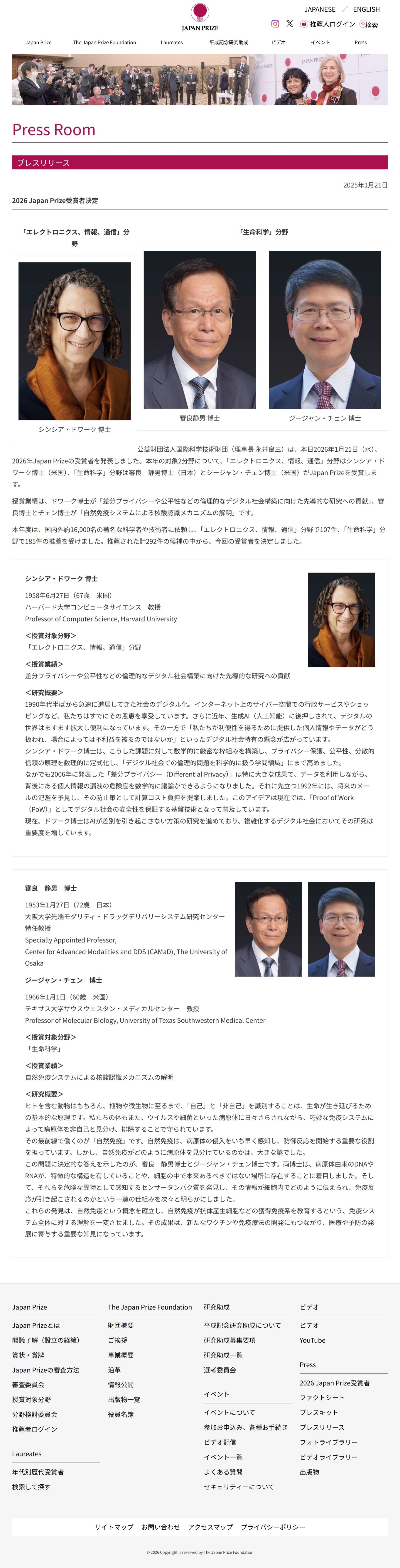 1月21日(水) 国際科学技術財団(Japan Prize)