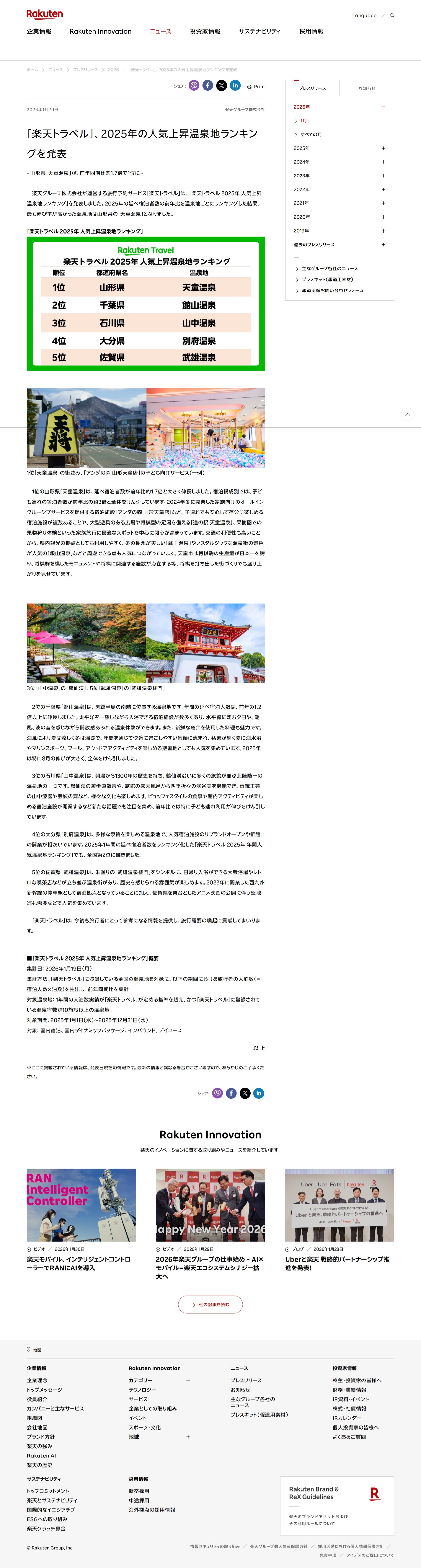 「楽天トラベル」、2025年の人気上昇温泉地ランキングを発表 | 楽天グループ株式会社