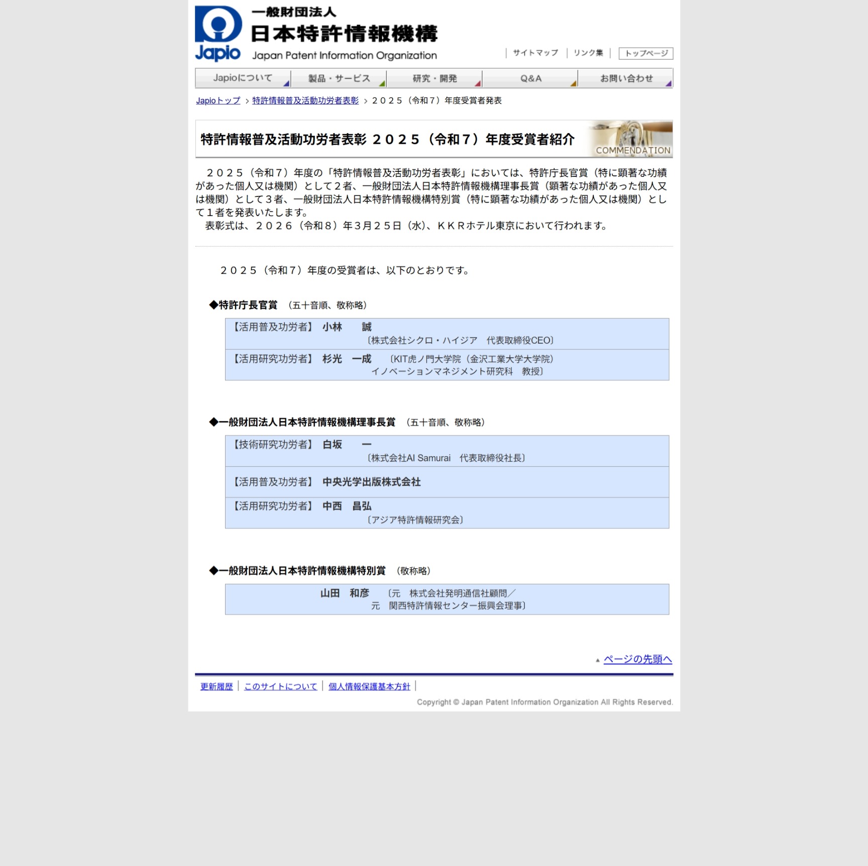 3月25日(水)功績賞に、東京理科大学工学部機械工学科の小林宏教授、特別賞に、沖縄科学技術大学院大学 神経計算ユニットの銅谷賢治教授を選出しています。