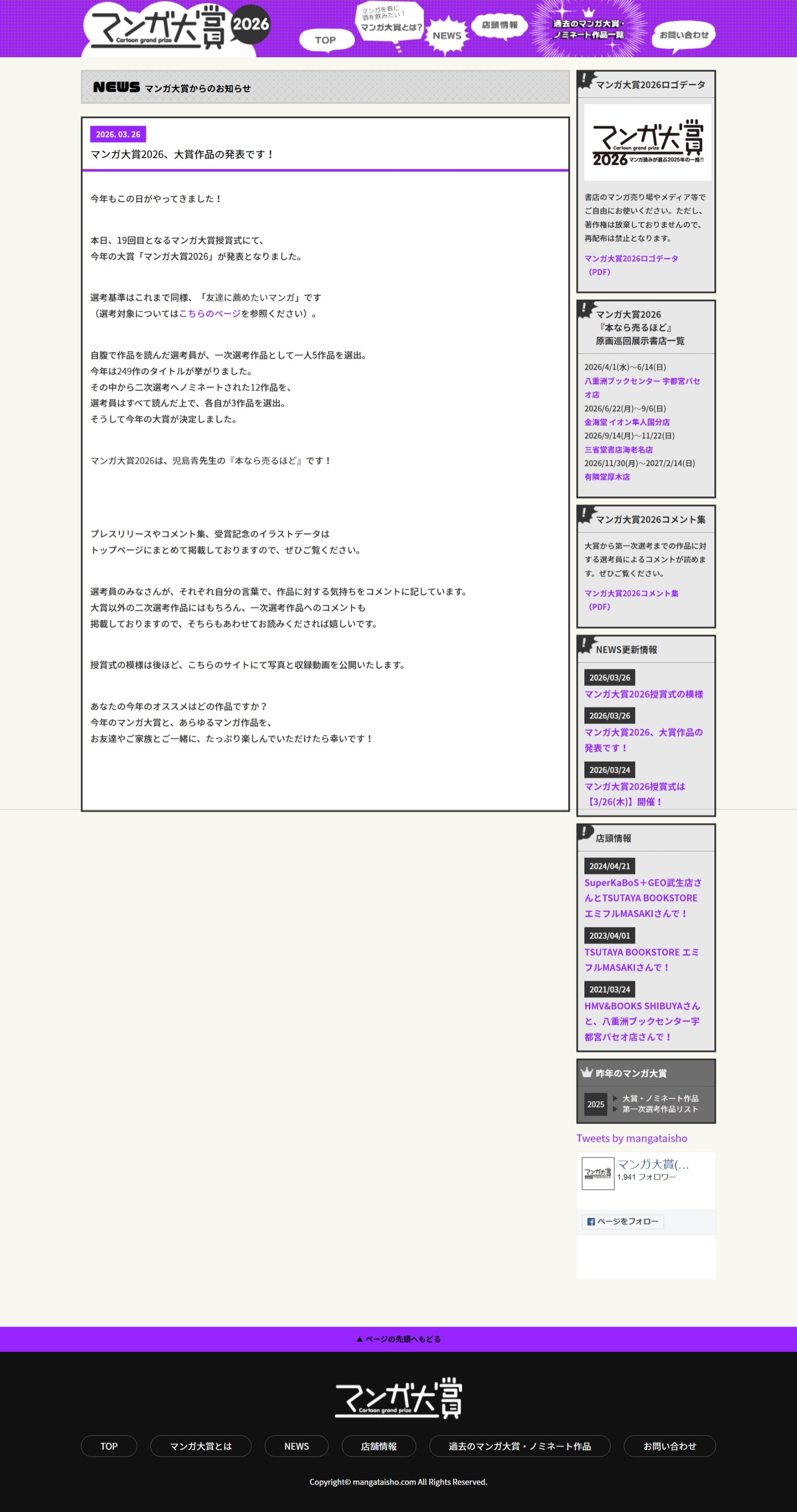 3月26日(木)本日、19回目となるマンガ大賞授賞式にて、今年の大賞「マンガ大賞2026」が発表となりました。