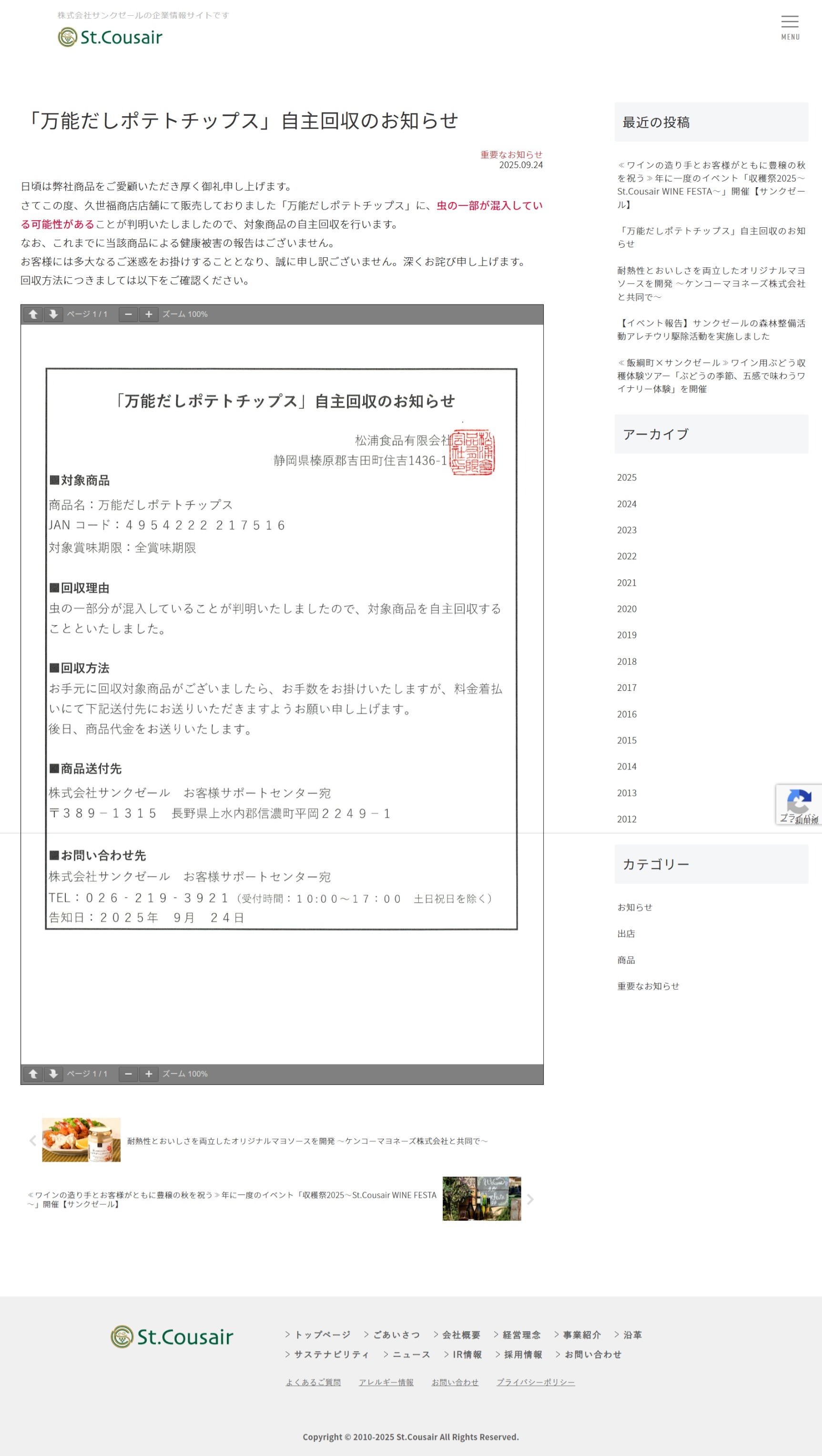 「万能だしポテトチップス」自主回収に関するお知らせとお詫び | 株式会社サンクゼールのプレスリリース
