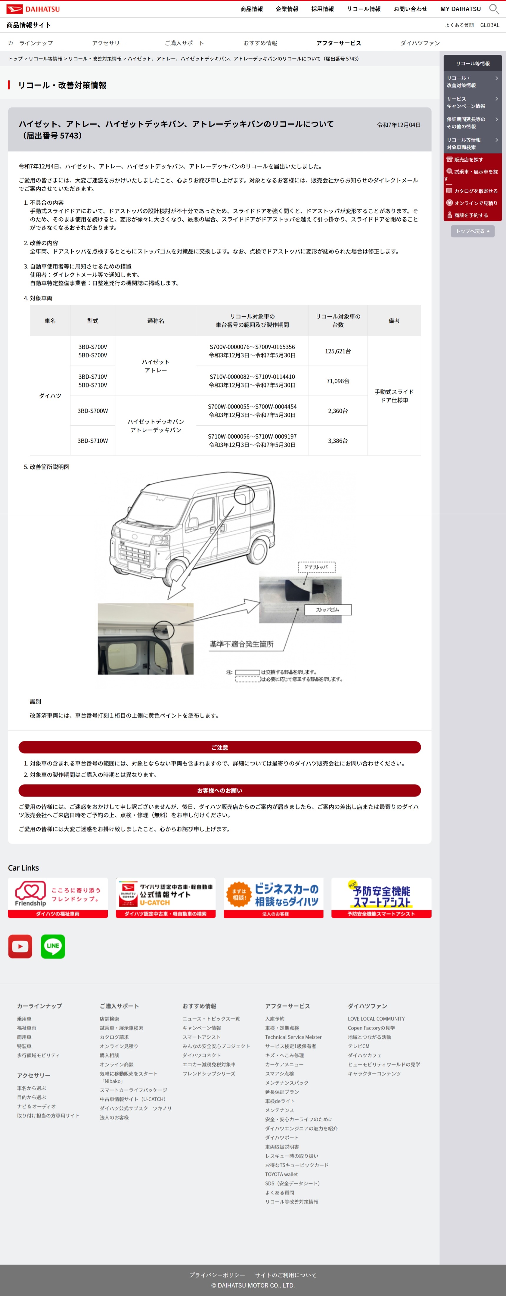 ハイゼット・アトレー系は商用利用が多く、ドアの開閉頻度も高いため、こうした機構部品の不具合がリコールにつながる要因となります。