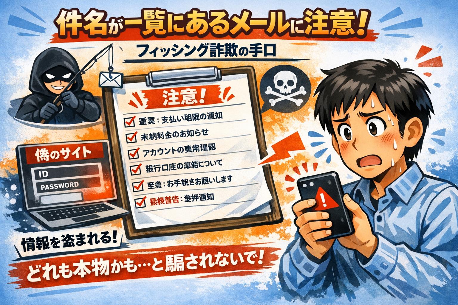※一覧中で英数字としているのは、番号:AB-123456789 のように整理番号のようなものを件名に付していることを示しています。正規のメールの件名にこのような整理番号が付いていることはありません。