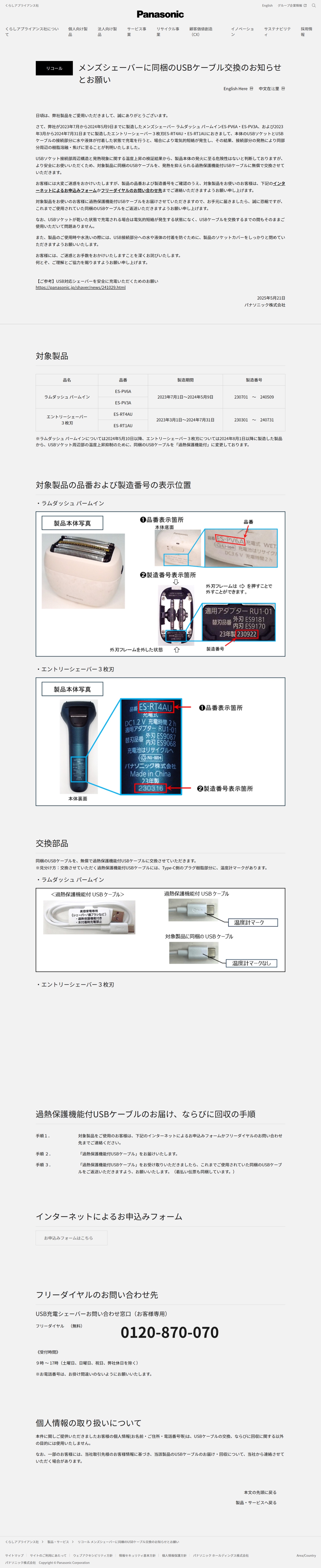リコール メンズシェーバーに同梱のUSBケーブル交換のお知らせとお願い | Panasonic