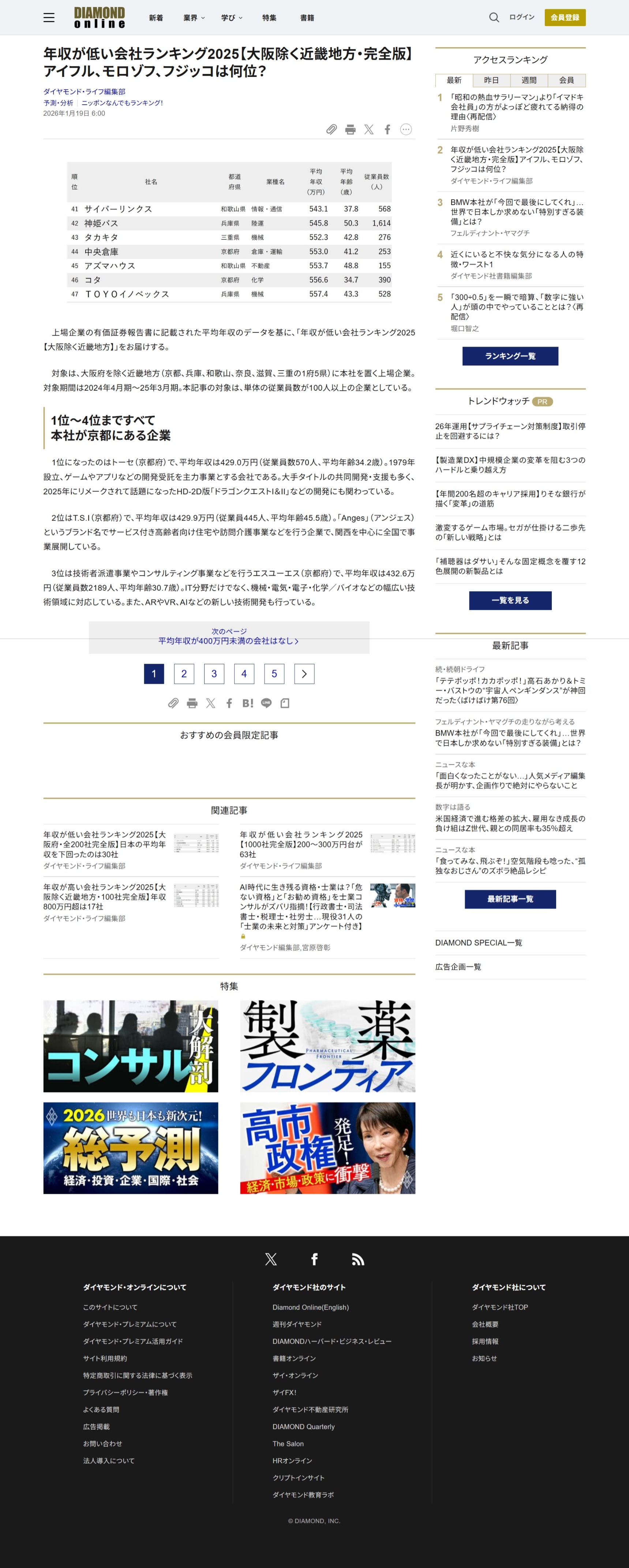 年収が低い会社ランキング2025【大阪除く近畿地方・完全版】アイフル、モロゾフ、フジッコは何位? | ニッポンなんでもランキング! | ダイヤモンド・オンライン
