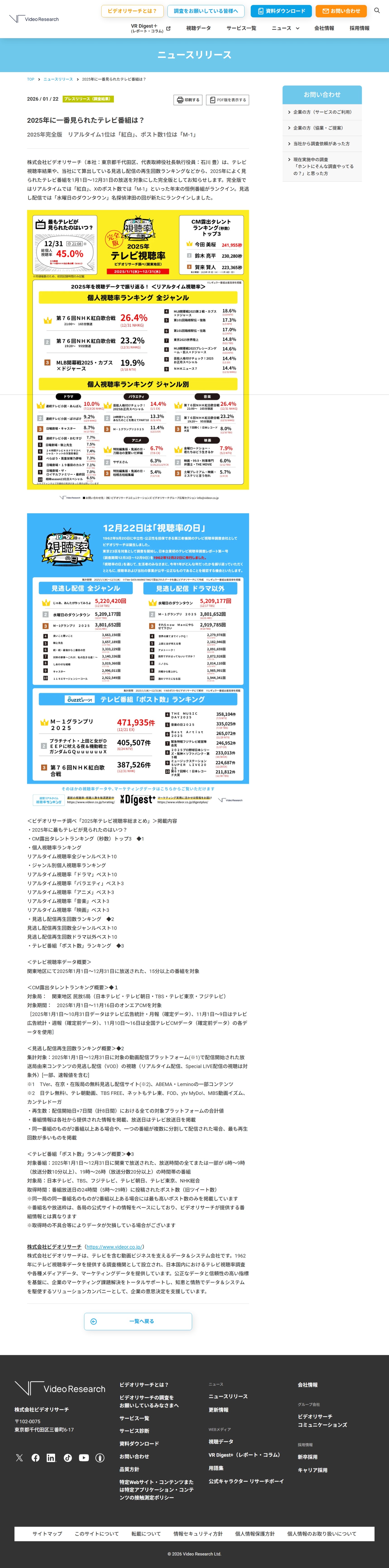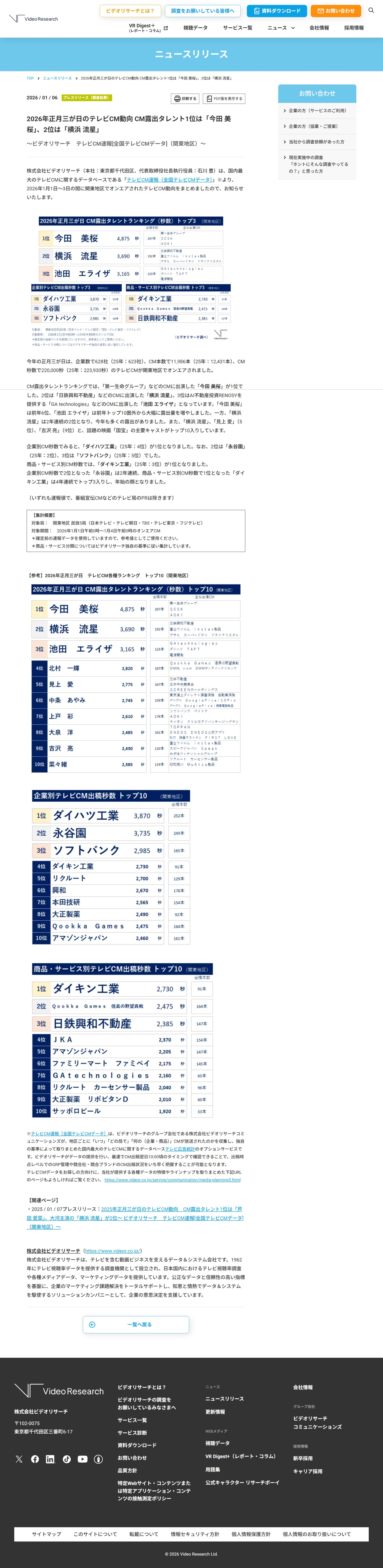 2026年正月三が日のテレビCM動向 CM露出タレント1位は「今田 美桜」、2位は「横浜 流星」 ~ビデオリサーチ テレビCM速報[全国テレビCMデータ](関東地区)~