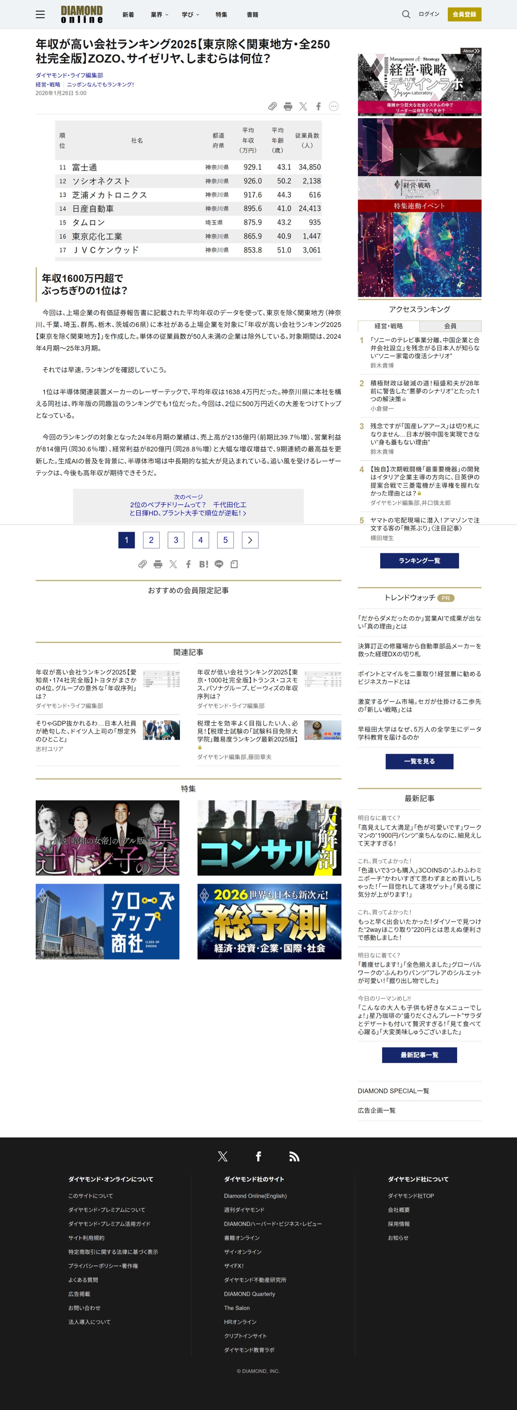 年収が高い会社ランキング2025【東京除く関東地方・全250社完全版】ZOZO、サイゼリヤ、しまむらは何位? | ニッポンなんでもランキング! | ダイヤモンド・オンライン