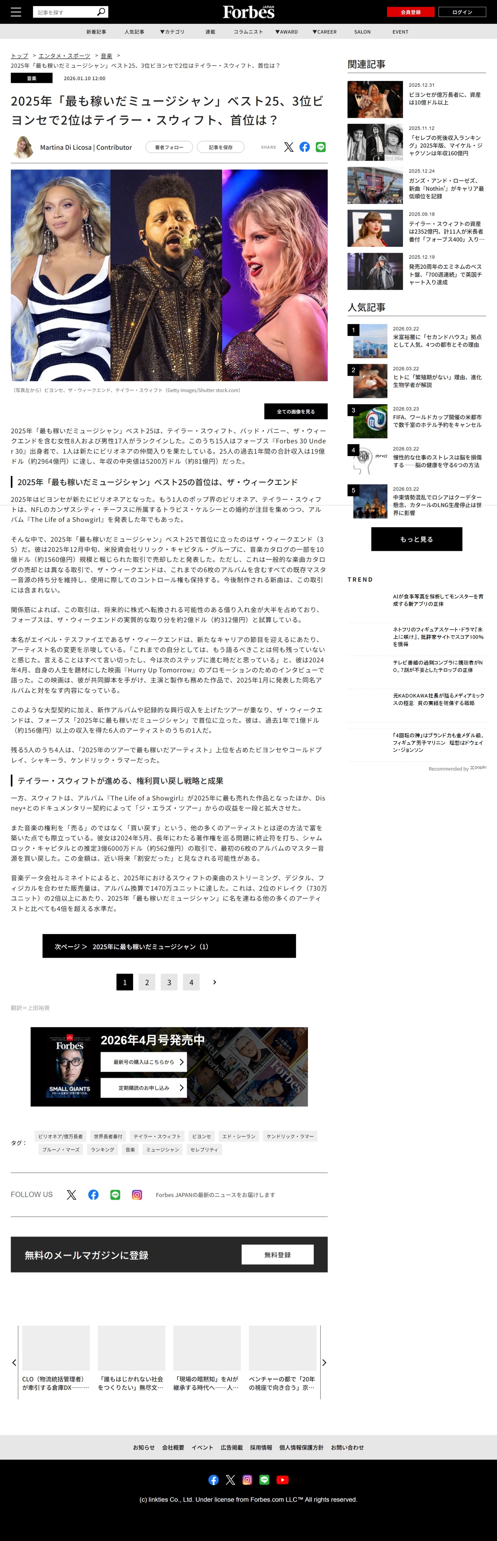 2025年「最も稼いだミュージシャン」ベスト25、3位ビヨンセで2位はテイラー・スウィフト、首位は? | Forbes JAPAN 公式サイト(フォーブス ジャパン)