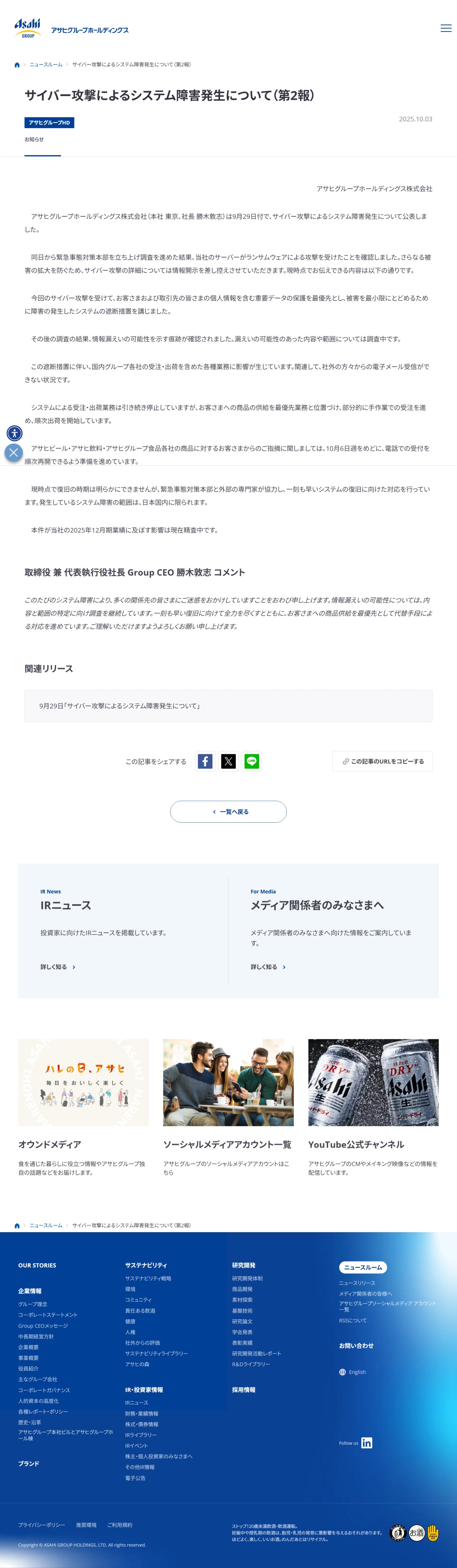 サイバー攻撃によるシステム障害発生について|ニュースルーム事案の概要:アサヒグループホールディングス株式会社は2025年9月29日、サイバー攻撃の影響により国内システムに障害が発生したと発表しました。現時点では個人情報や顧客データの外部流出は確認されていないものの、システム障害により国内グループ各社の受注・出荷業務やお客様相談室などのコールセンター業務が停止している状況です。復旧に向けた調査と対応が進められていますが、復旧のめどは立っていないとしています。なお、障害の影響は日本国内に限定されており、同社は顧客および取引先に対し謝罪の意を表明しています。