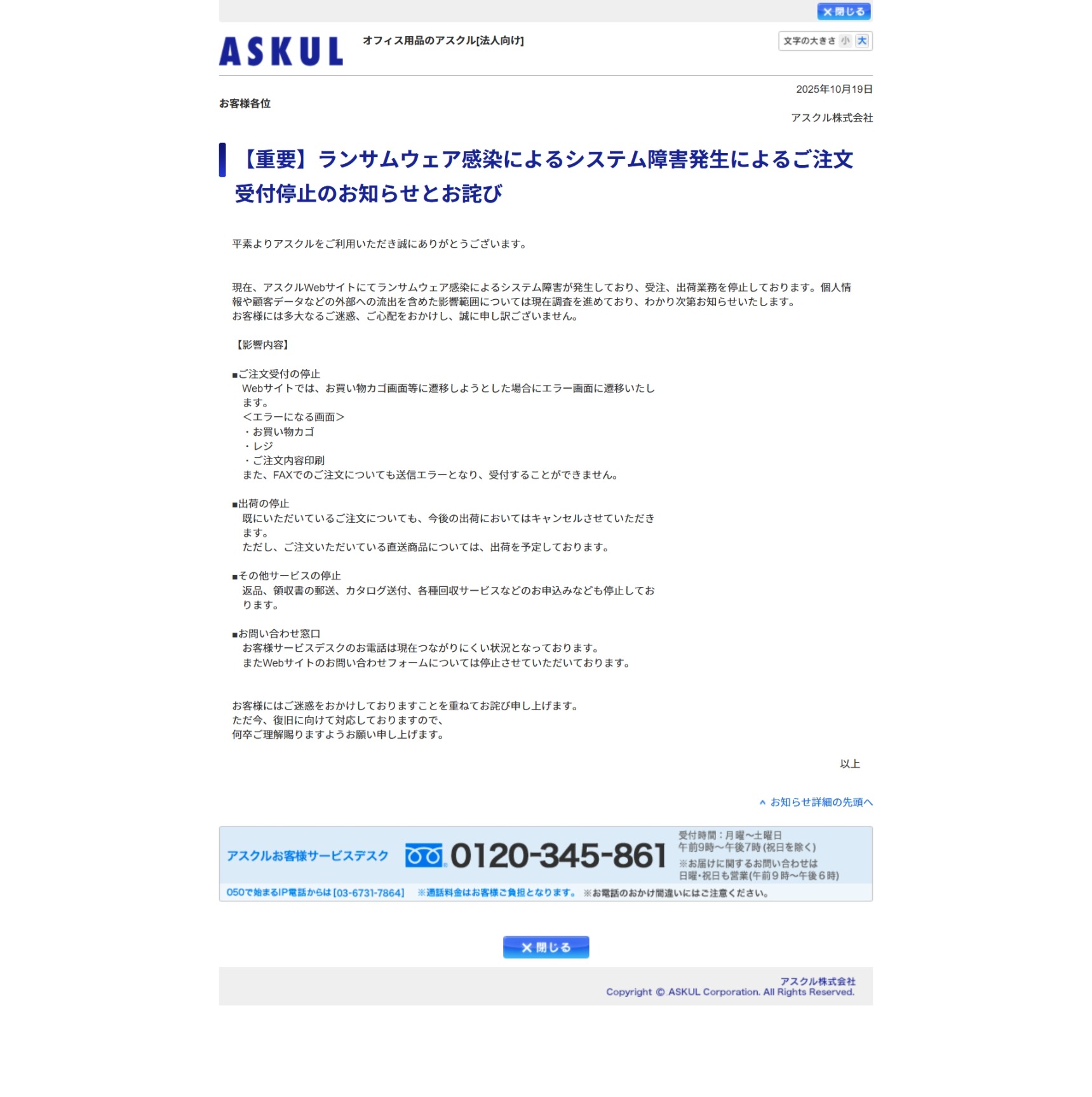 【重要】ランサムウェア感染によるシステム障害発生によるご注文受付停止のお知らせとお詫び事案の概要:オフィス用品を取り扱うアスクル株式会社は、2025年10月19日、同社のWebサイトがランサムウェアに感染したことにより、システム障害が発生し、受注および出荷業務を停止していると発表しました。現在、個人情報や顧客データの外部流出を含む影響範囲について調査が進められており、FAX注文や返品、領収書の郵送、カタログ送付などの各種サービスも停止されています。すでに受け付けた注文についてもキャンセルとなる可能性がある一方で、一部の直送商品は出荷予定とされています。問い合わせ窓口も電話・Webともに利用が困難な状況で、同社は復旧に向けて対応を進めているとし、利用者に理解と協力を求めています。
