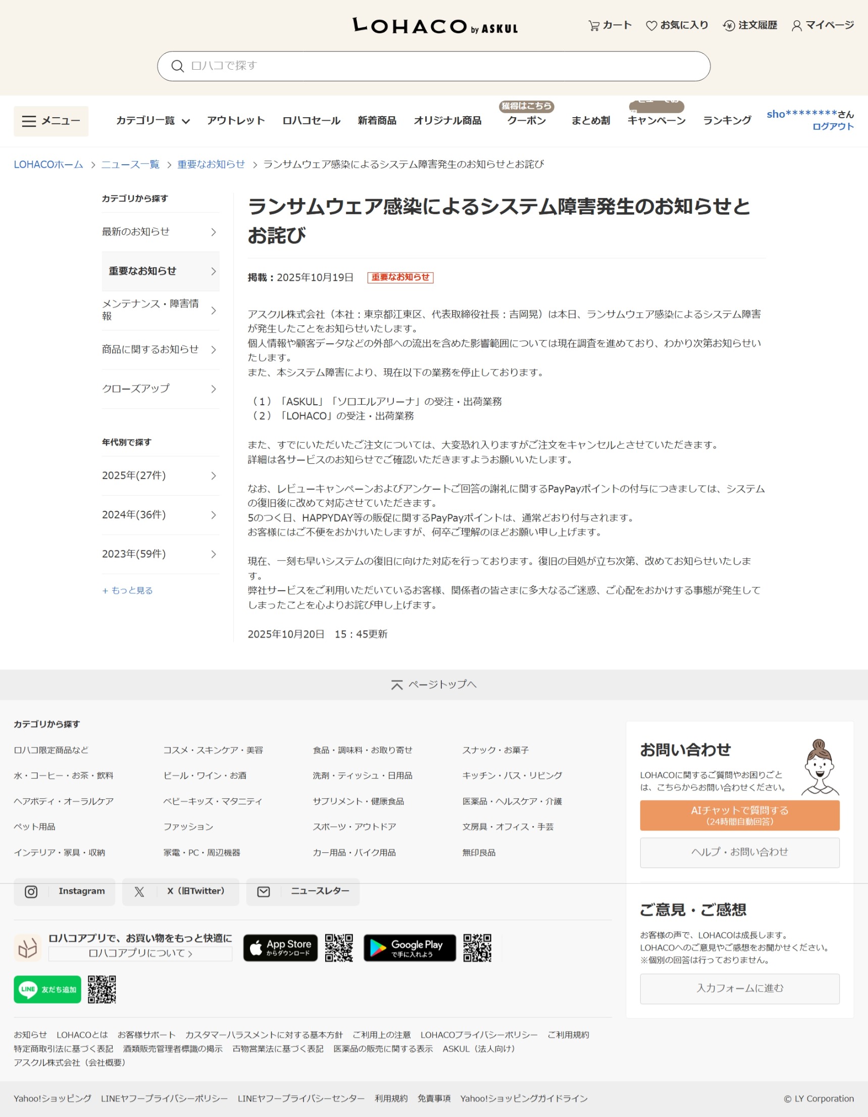 LOHACO – ランサムウェア感染によるシステム障害発生のお知らせとお詫び事案の概要:LOHACOを運営するアスクル株式会社は2025年10月19日、同社のシステムがランサムウェアに感染したことにより、LOHACOを含む複数サービスにおいて受注・出荷業務を一時停止していると発表しました。これに伴い、すでに受け付けた注文はキャンセルとなり、レビューキャンペーンやアンケート謝礼に関するPayPayポイントの付与は復旧後に対応される予定です。一方で、通常の販促施策に関するポイント付与は継続されています。現在、個人情報や顧客データの外部流出の有無を含めた影響範囲について調査が進められており、LOHACOは利用者に対し深く謝罪するとともに、早期復旧に向けた対応を進めているとしています。