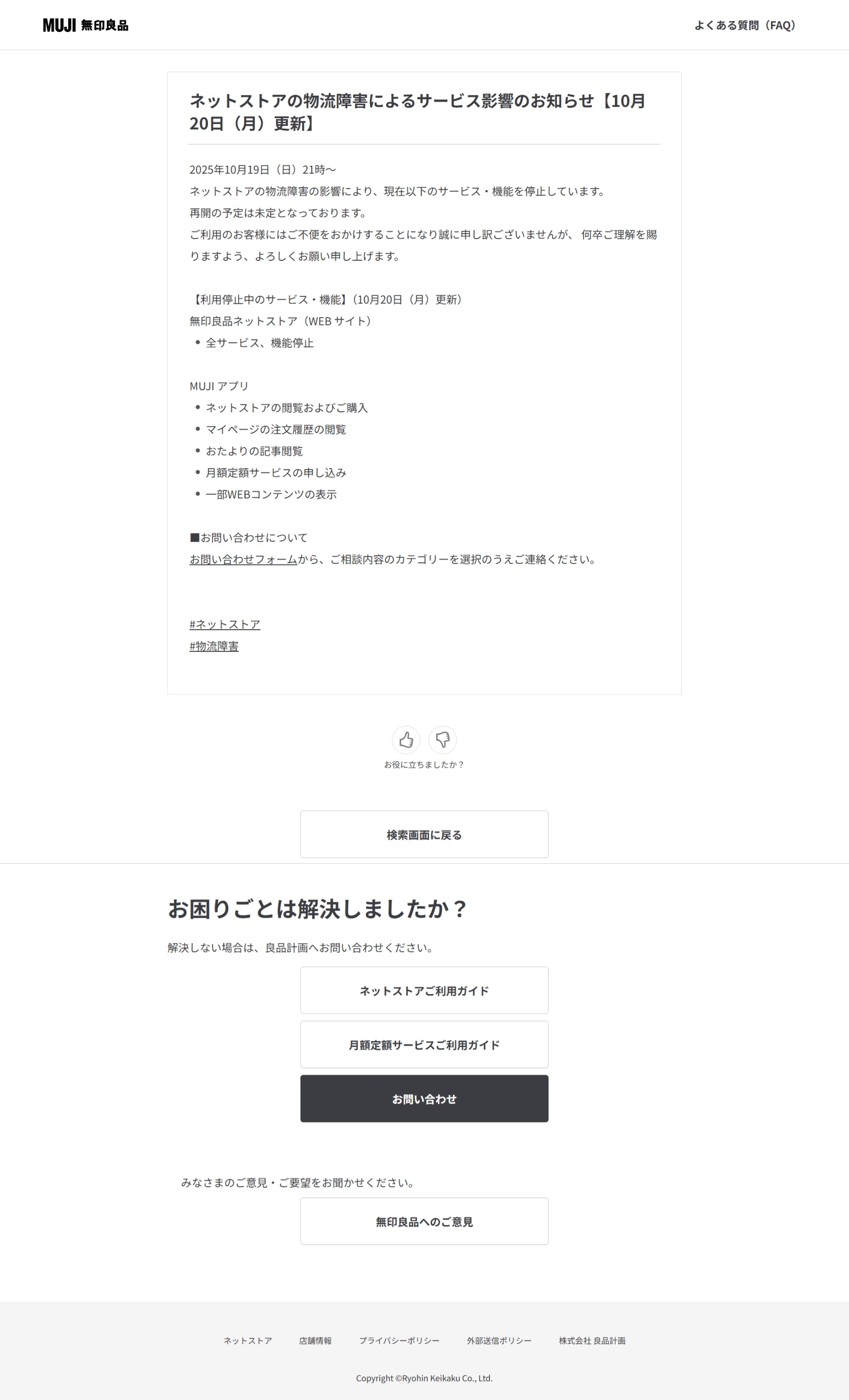ネットストアの物流障害によるサービス影響のお知らせ【10月20日(月)更新】 – よくある質問 | 無印良品概要:無印良品を運営する株式会社良品計画は、2025年10月19日(日)21時頃から発生した物流障害の影響により、ネットストア関連の全サービスと機能を停止していると発表しました。対象には公式ウェブサイトでの閲覧・購入、MUJIアプリの利用、注文履歴の確認、月額定額サービスの申し込み、一部ウェブコンテンツの表示などが含まれており、再開の目途は現時点で立っていないとのことです。利用者には多大な不便を強いる事態となっており、同社は「ご理解を賜りますようお願い申し上げます」と謝罪しています。問い合わせは専用フォームから受け付けており、今後の対応が注目されます。