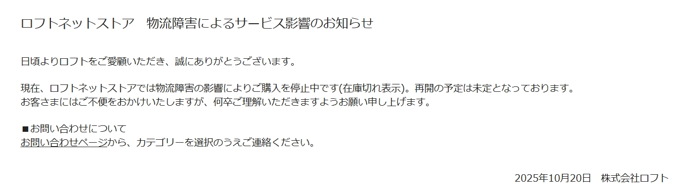 重要なお知らせ|ロフトネットストア 物流障害によるサービス影響のお知らせ概要:株式会社ロフトは2025年10月20日、公式ウェブサイトにて、ロフトネットストアにおいて物流障害が発生し、現在すべての商品が「在庫切れ」表示となり、購入手続きが停止されていると発表しました。サービス再開の時期は未定であり、同社は利用者に対し不便をかけていることを謝罪するとともに、理解と協力を求めています。問い合わせについては、専用ページからカテゴリーを選択して連絡するよう案内されています。