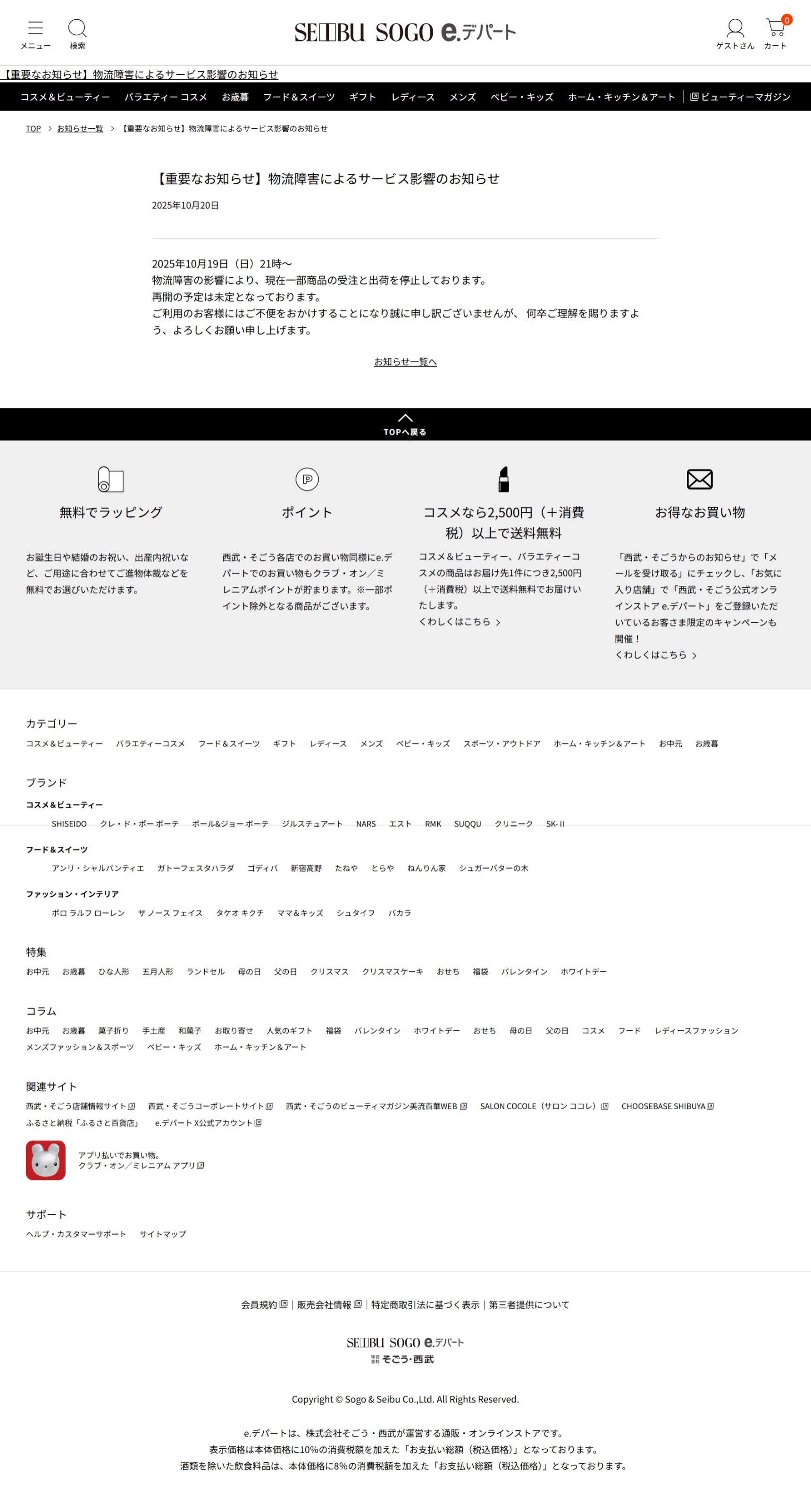 【重要なお知らせ】物流障害によるサービス影響のお知らせ – 西武・そごうのオンラインストア e.デパート事案の概要:株式会社そごう・西武が運営するオンラインストア「e.デパート」は、2025年10月19日(日)21時以降に発生した物流障害の影響により、一部商品の受注および出荷を停止していることを発表しました。現時点でサービス再開の目途は立っておらず、利用者に対しては不便をかけることへの謝罪と理解を求めるコメントが掲載されています。なお、同ストアではコスメやギフトなど多岐にわたる商品を取り扱っており、通常は一定金額以上の購入で送料無料サービスなども提供されています。