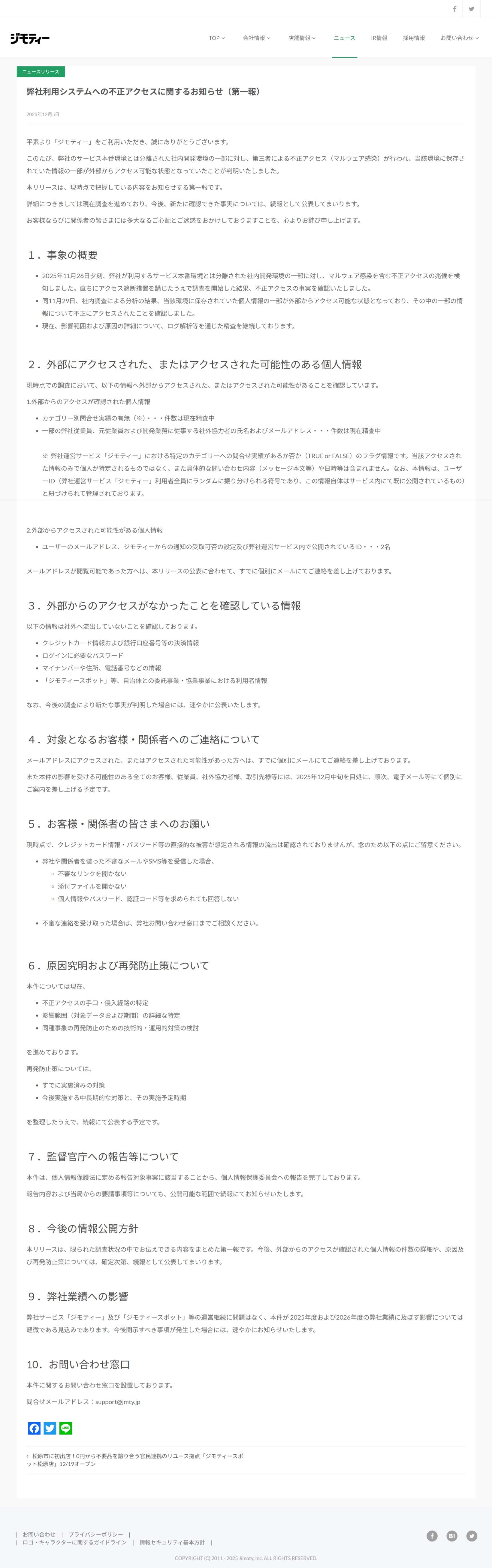 一方で、クレジットカード情報や銀行口座などの決済情報、ログインパスワード、住所、電話番号などの機密性の高い個人情報については、外部への流出は確認されていないとしています。また、自治体と連携して運営する「ジモティースポット」などの利用者情報への影響もないとのことです。