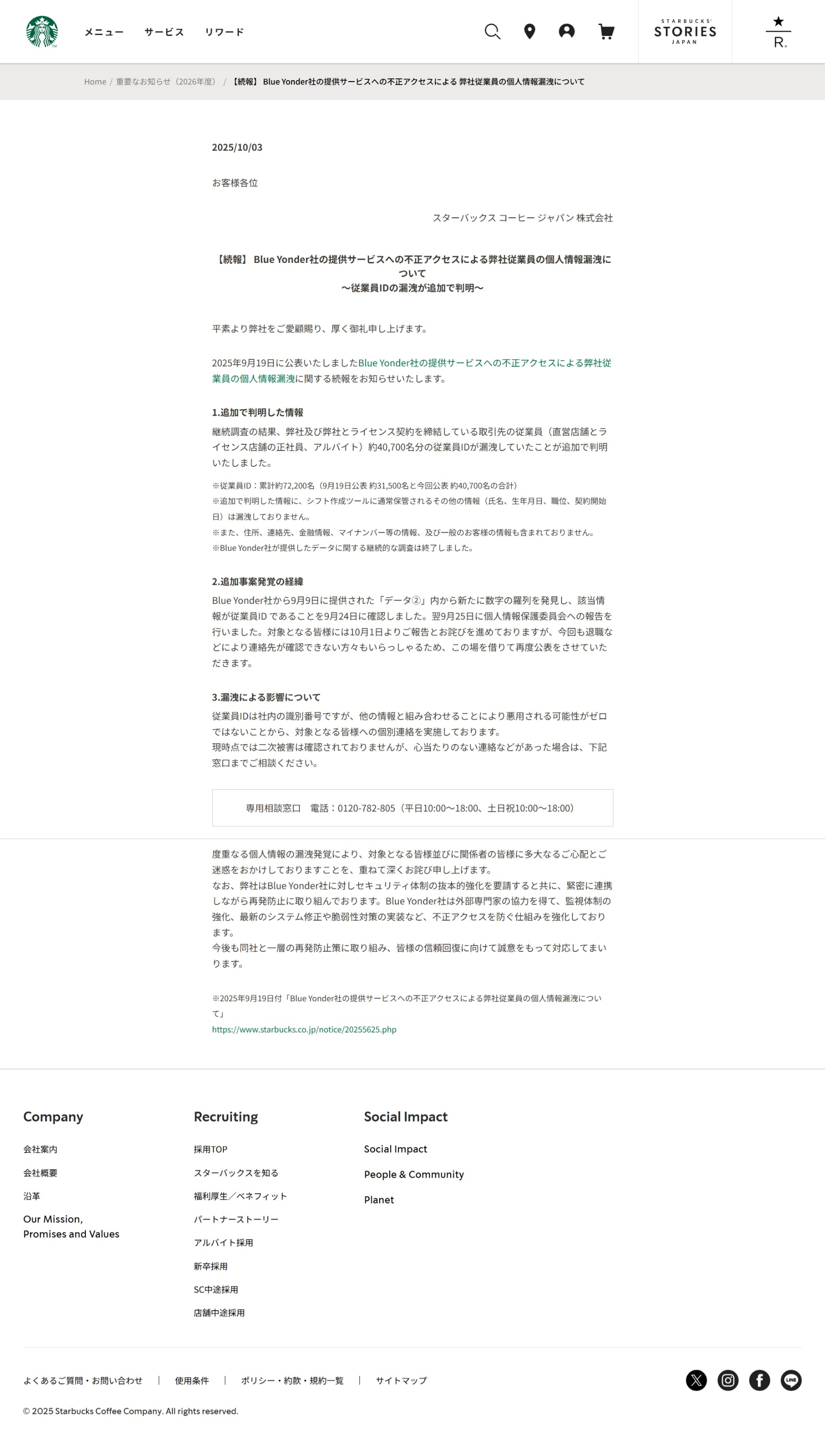 第一報のリリースにもあるとおり、Blue Yonderから日本のスターバックスに連絡が入ったのは今年の5月で、具体的な被害内容は9月に明らかになり、今回はさらに追加で漏えいが判明しました。