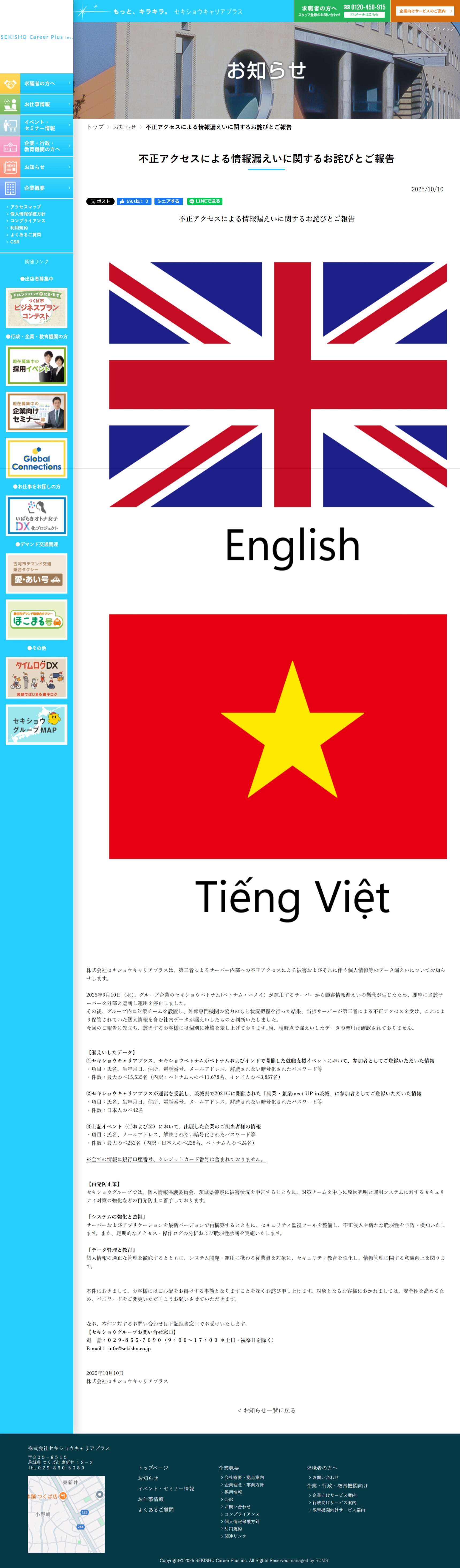 不正アクセスによる情報漏えいに関するお詫びとご報告事案の概要:株式会社セキショウキャリアプラスは、2025年9月にグループ企業のセキショウベトナム(ベトナム・ハノイ)が運用する海外サーバーに対して第三者による不正アクセスがあり、最大で延べ15,829名分の個人情報が漏えいした可能性があると発表しました。漏えいの対象には、ベトナムおよびインドで開催された就職支援イベントの参加者情報や、茨城県で実施された副業・兼業イベントの登録者情報、出展企業担当者の氏名や連絡先などが含まれており、銀行口座やクレジットカード情報は含まれていないとしています。同社は、外部専門機関と連携して原因究明と再発防止策に取り組んでおり、サーバーの再構築やセキュリティ監視体制の強化、従業員への教育を進めるとともに、対象者には個別に連絡を行い、パスワード変更などの対応を呼びかけています。