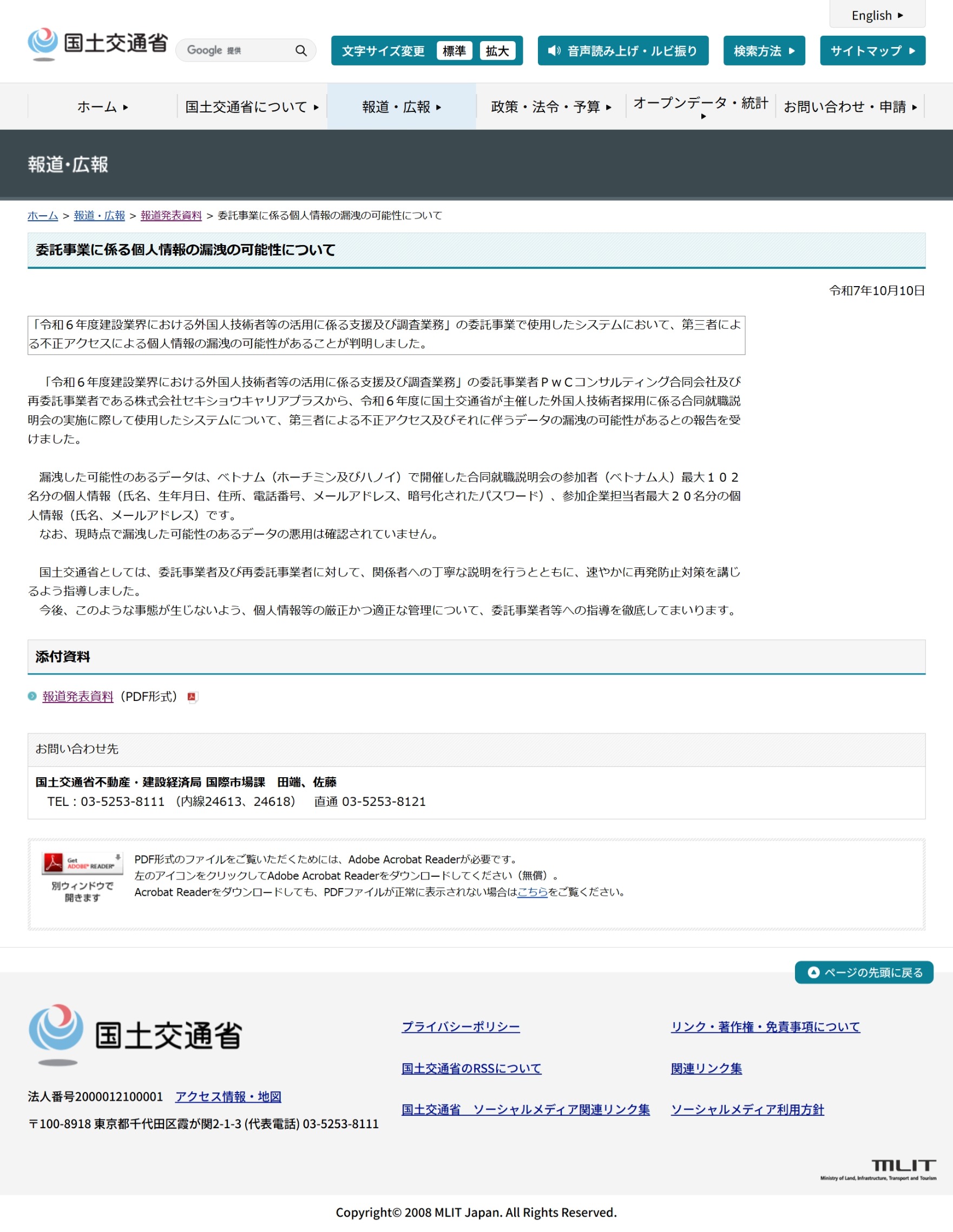 委託事業に係る個人情報の漏洩の可能性について 事案の概要:国土交通省は、令和6年度に実施した「建設業界における外国人技術者等の活用に係る支援及び調査業務」に関連する委託事業において、使用されたシステムが第三者による不正アクセスを受け、個人情報が漏えいした可能性があると発表しました。報告によると、ベトナムで開催された合同就職説明会の参加者最大102名分の氏名や連絡先、暗号化されたパスワードなどの情報と、参加企業担当者最大20名分の氏名・メールアドレスが対象となっており、現時点では悪用の確認はされていないとのことです。国土交通省は、委託・再委託事業者に対して関係者への丁寧な説明と再発防止策の徹底を指導し、今後も個人情報の厳正な管理を強化していく方針です。