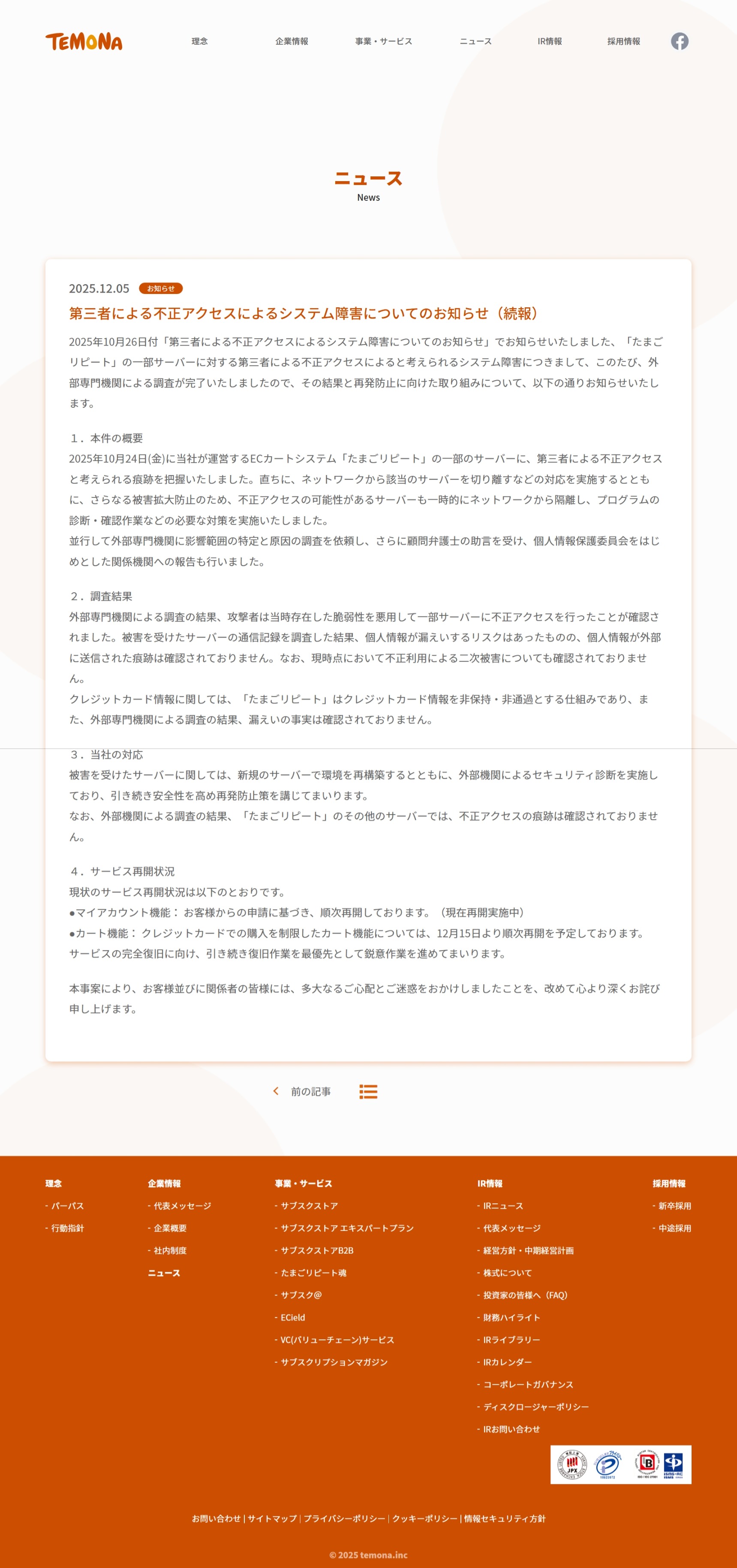 第三者による不正アクセスによるシステム障害についてのお知らせ | テモナ株式会社