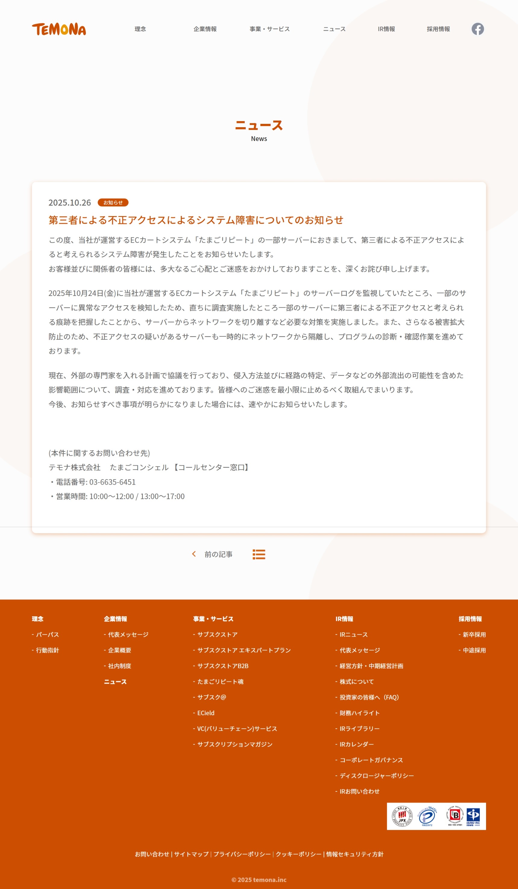 第三者による不正アクセスによるシステム障害についてのお知らせ | テモナ株式会社