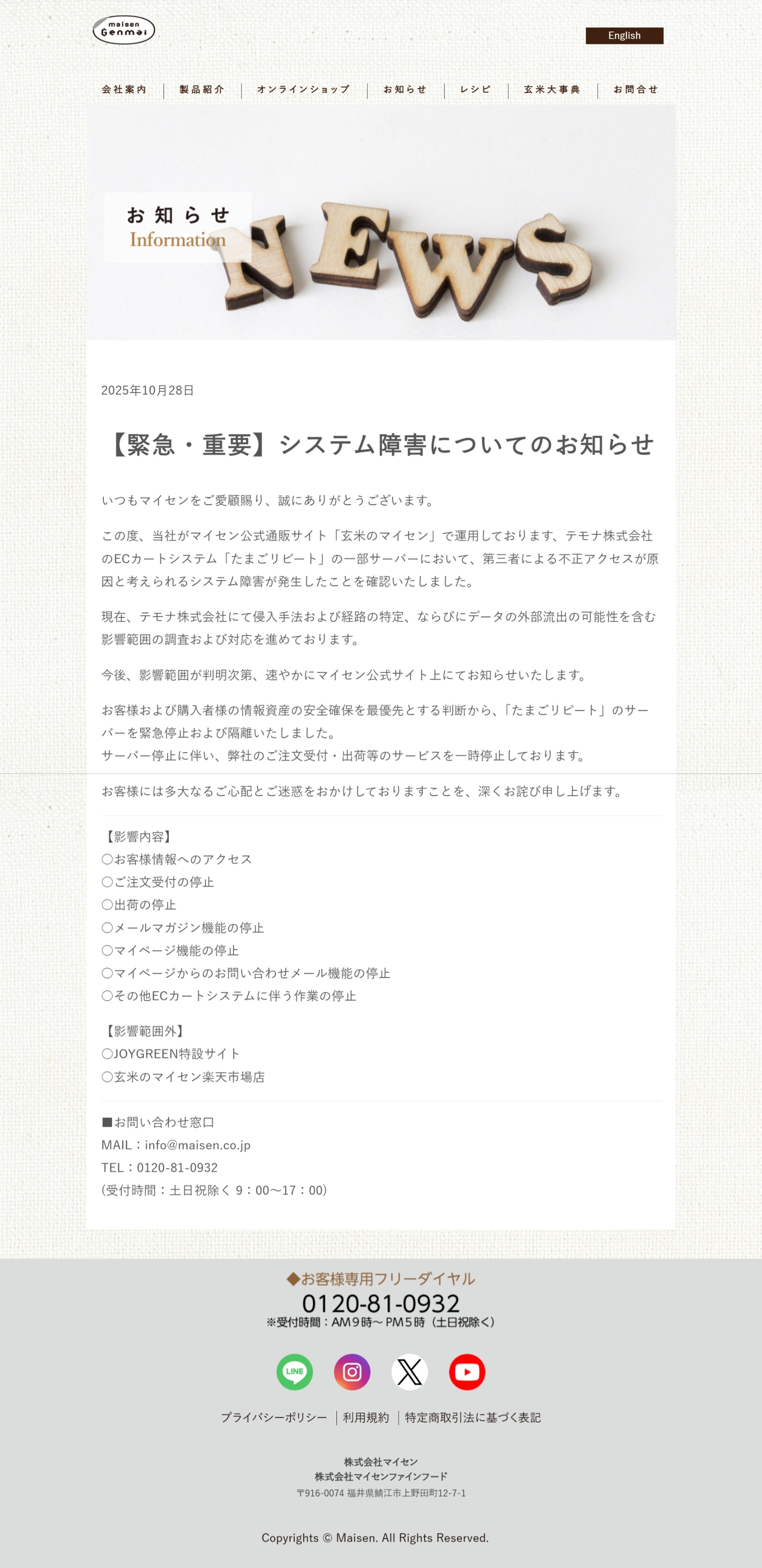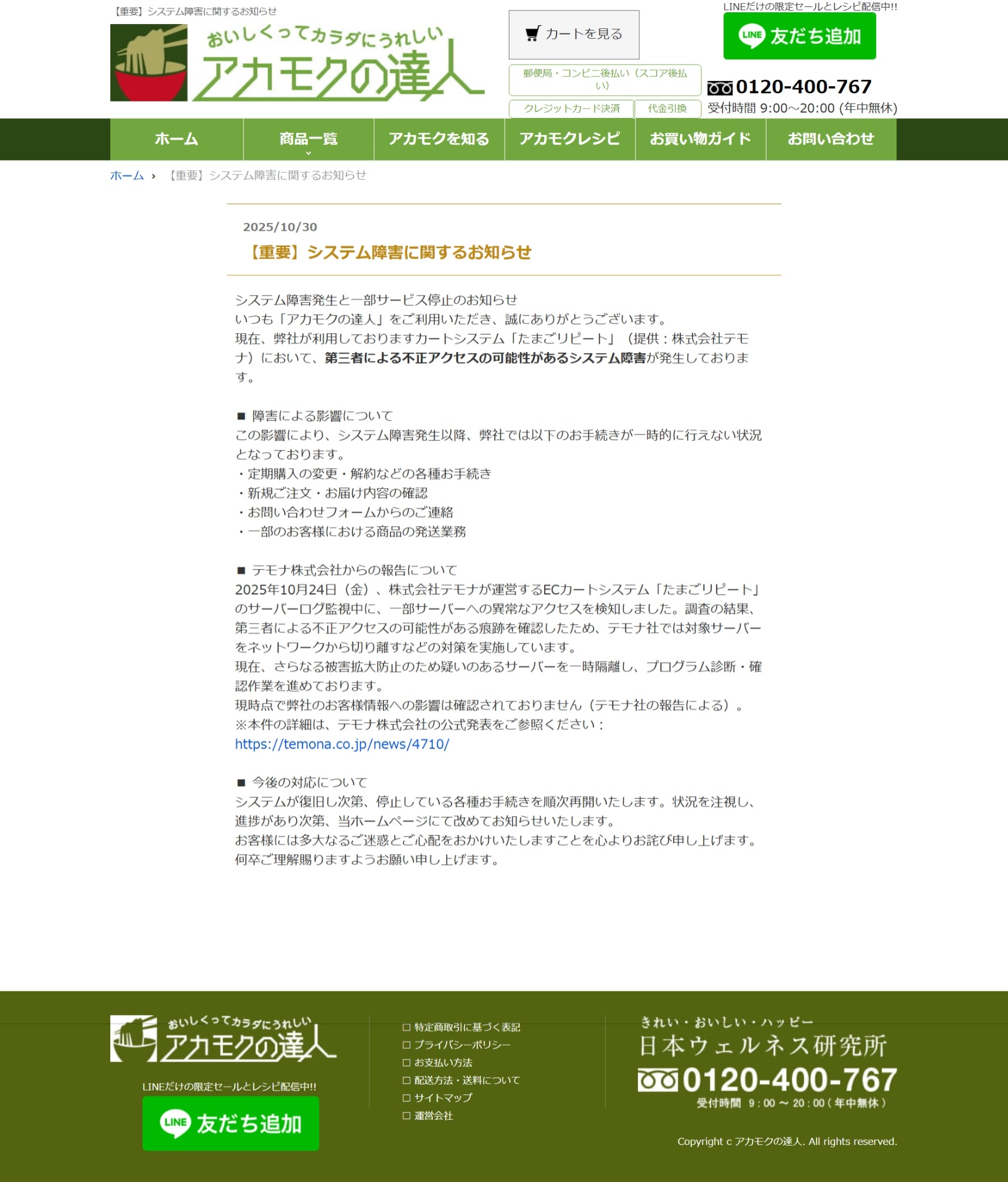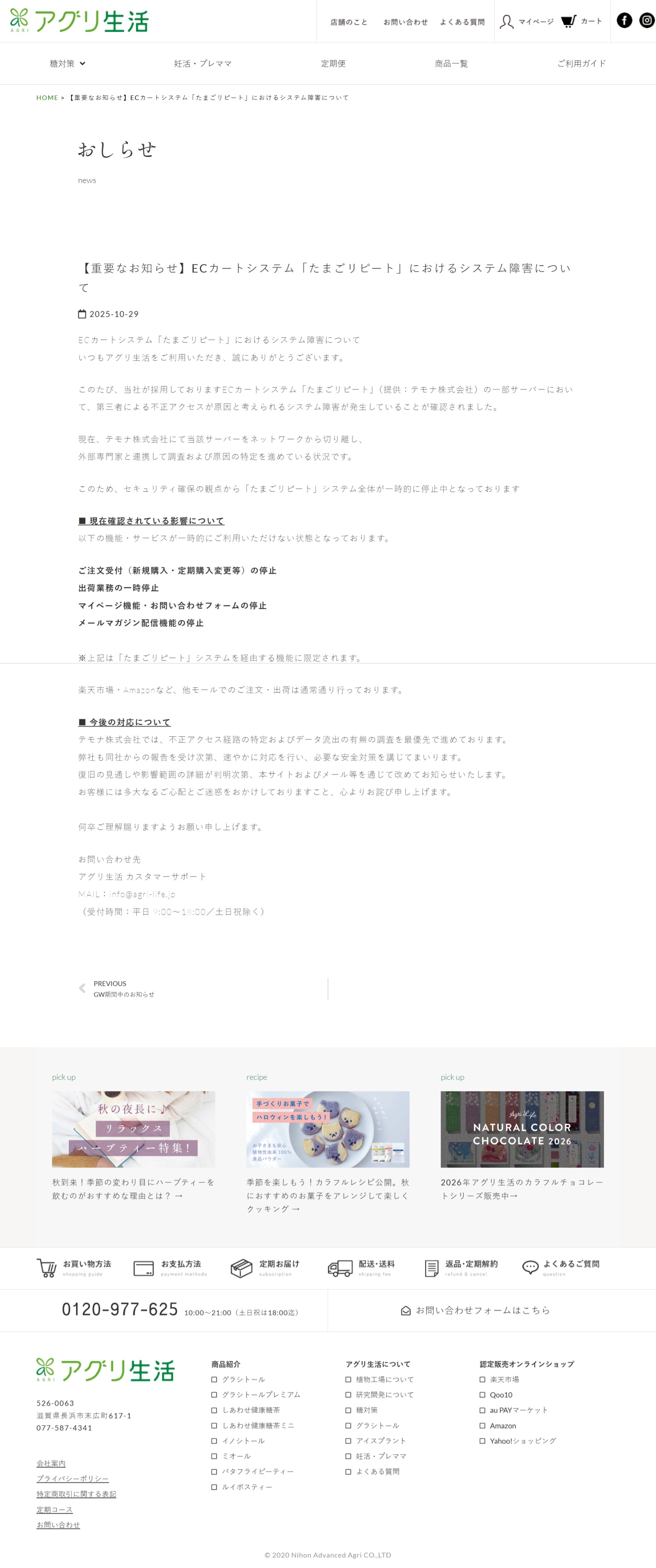 【重要なお知らせ】ECカートシステム「たまごリピート」におけるシステム障害について