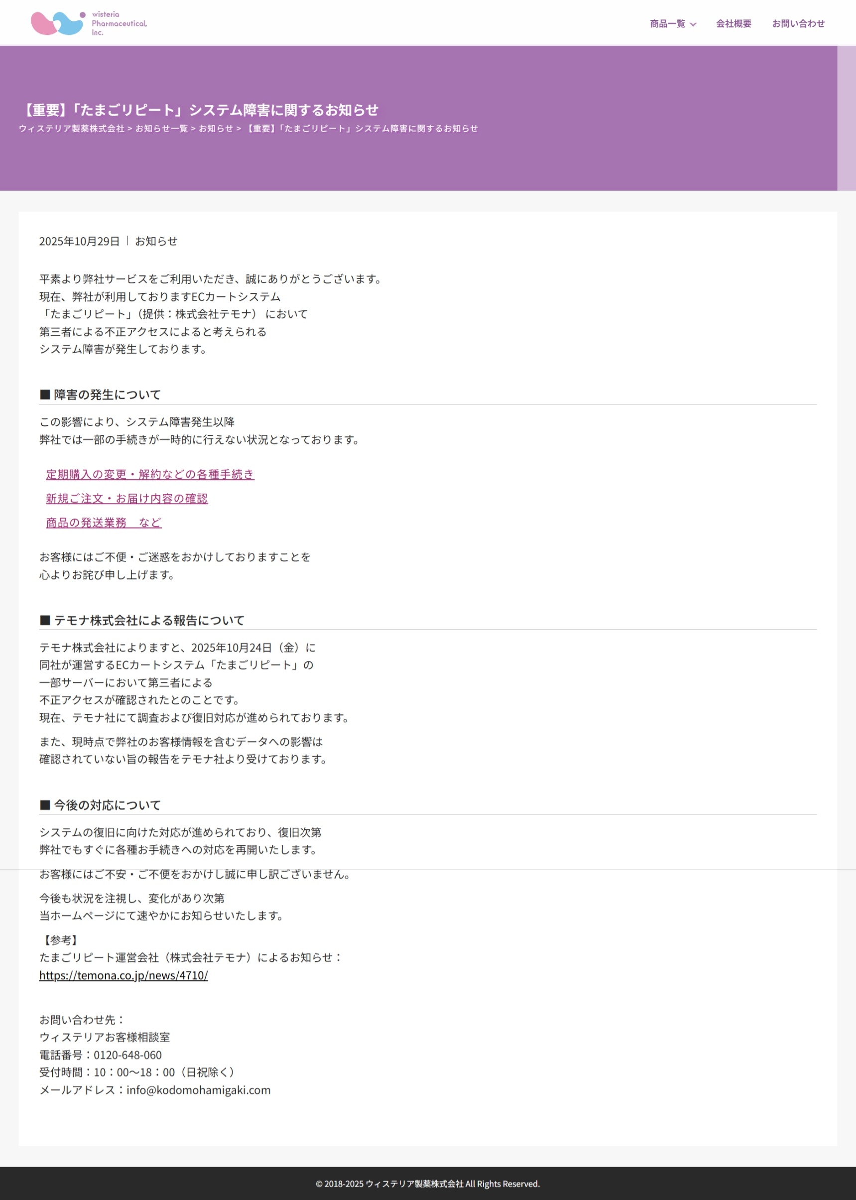 【重要】「たまごリピート」システム障害に関するお知らせ | ウィステリア製薬株式会社