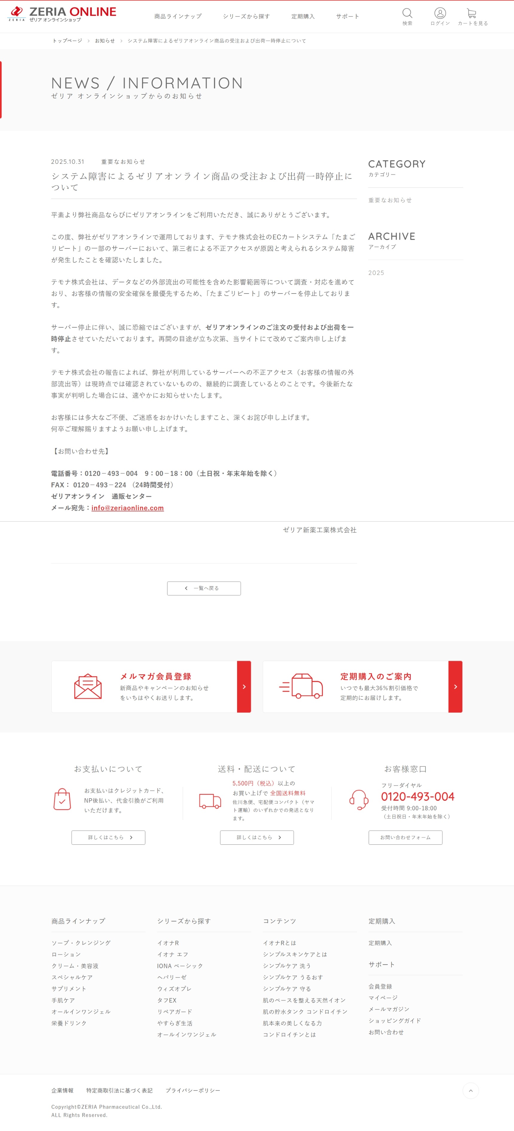 システム障害による弊社通販サイト(ゼリアオンライン)商品の 受注および出荷一時停止について