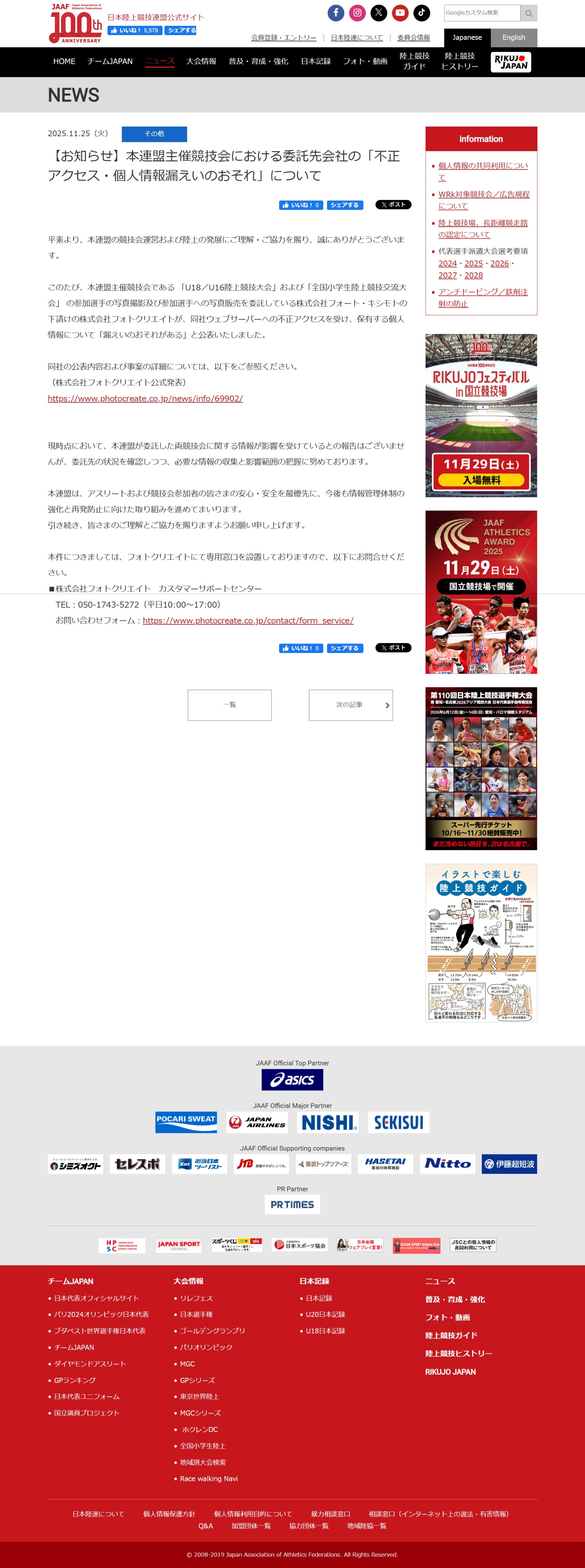 学校向け写真販売サービスなどを手掛ける株式会社フォトクリエイト(東京都新宿区)のサーバーが不正アクセスを受けた問題で、影響が日本陸上競技連盟(JAAF)の主催大会にも及んでいることが11月25日、明らかになりました。