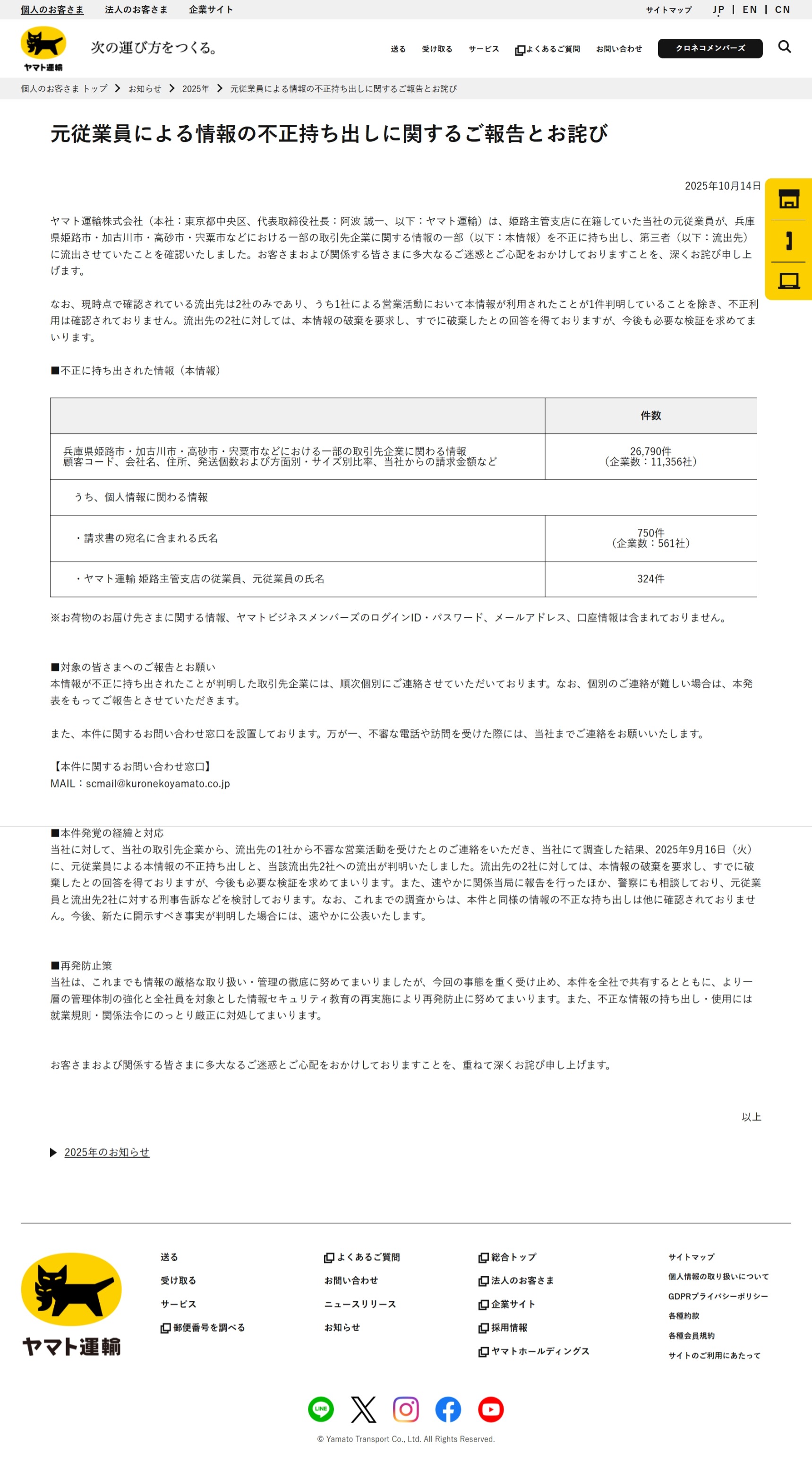 元従業員による情報の不正持ち出しに関するご報告とお詫び | ヤマト運輸事案の概要:ヤマト運輸株式会社は2025年10月14日、同社の元従業員が兵庫県内の一部取引先企業に関する情報を不正に持ち出し、第三者に流出させていたことを明らかにしました。流出した情報は、顧客コードや会社名、住所、発送個数などを含む26,790件(11,356社分)で、このうち750件には個人名が含まれていたとしています。現時点で情報が不正に利用された事例は1件確認されており、流出先2社には情報の破棄を要請し、すでに破棄されたとの回答を得たとしています。同社は、関係先への個別連絡を進めるとともに、警察への相談や刑事告訴の検討を行っており、再発防止策として情報管理体制の強化と社員教育の再実施を進める方針です。