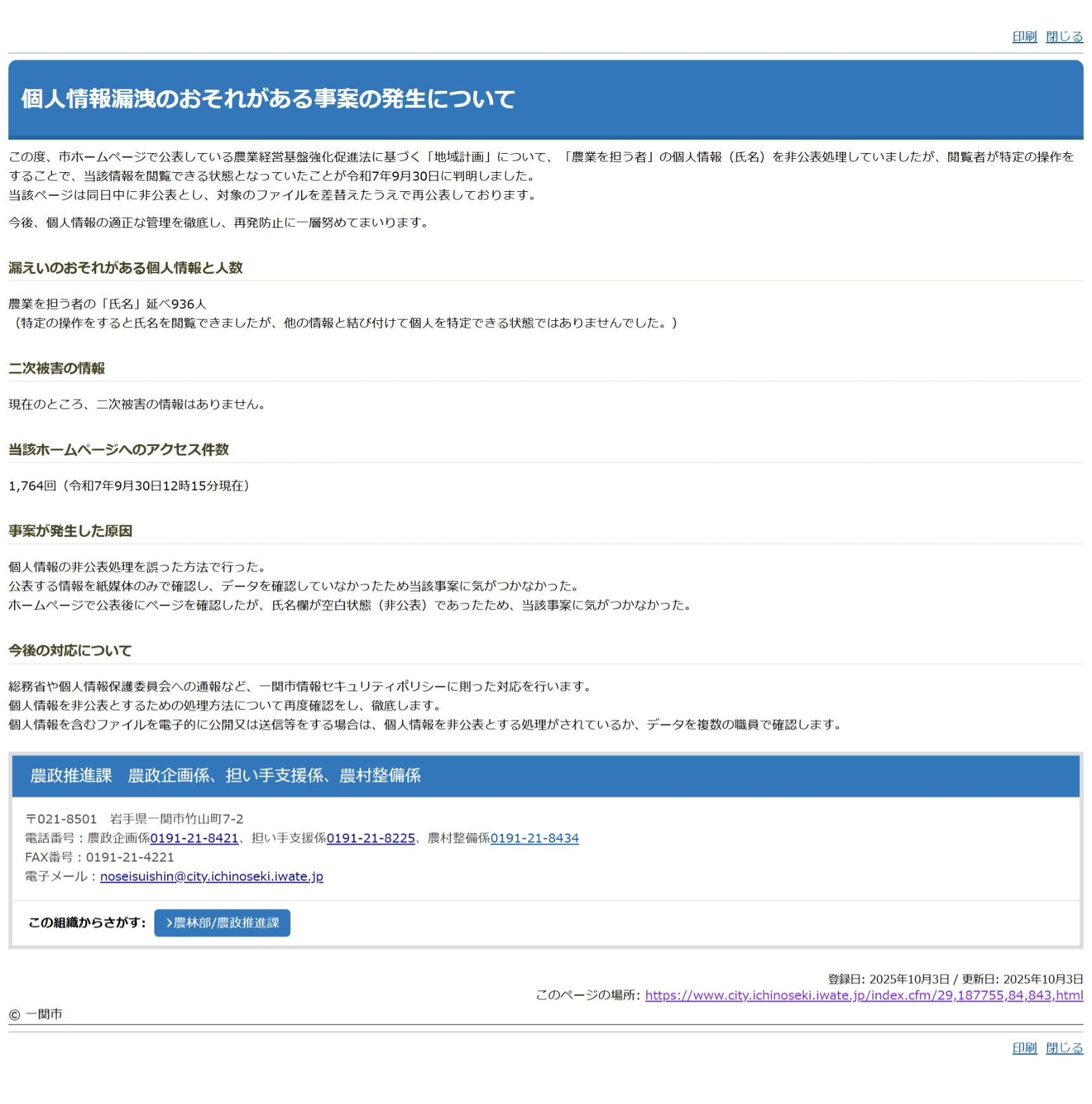 個人情報漏洩のおそれがある事案の発生について – 一関市事案の概要:岩手県一関市は、農業経営基盤強化促進法に基づく「地域計画」の公表ページにおいて、非公表処理されていた「農業を担う者」の氏名が、特定の操作により閲覧可能な状態となっていたことが令和7年9月30日に判明したと発表しました。対象となる個人情報は延べ936人分の氏名で、他の情報と結び付けて個人を特定できる状態ではなかったとしています。市は同日中に該当ページを非公開とし、修正後に再公表を行いました。現在のところ二次被害の報告はなく、アクセス件数は1,764回に上っています。原因は非公表処理の方法に誤りがあったことと、紙媒体での確認に依存しデータの確認が不十分だったことによるもので、市は今後、総務省や個人情報保護委員会への通報を含めた対応を行い、再発防止に向けて管理体制の強化を図るとしています。