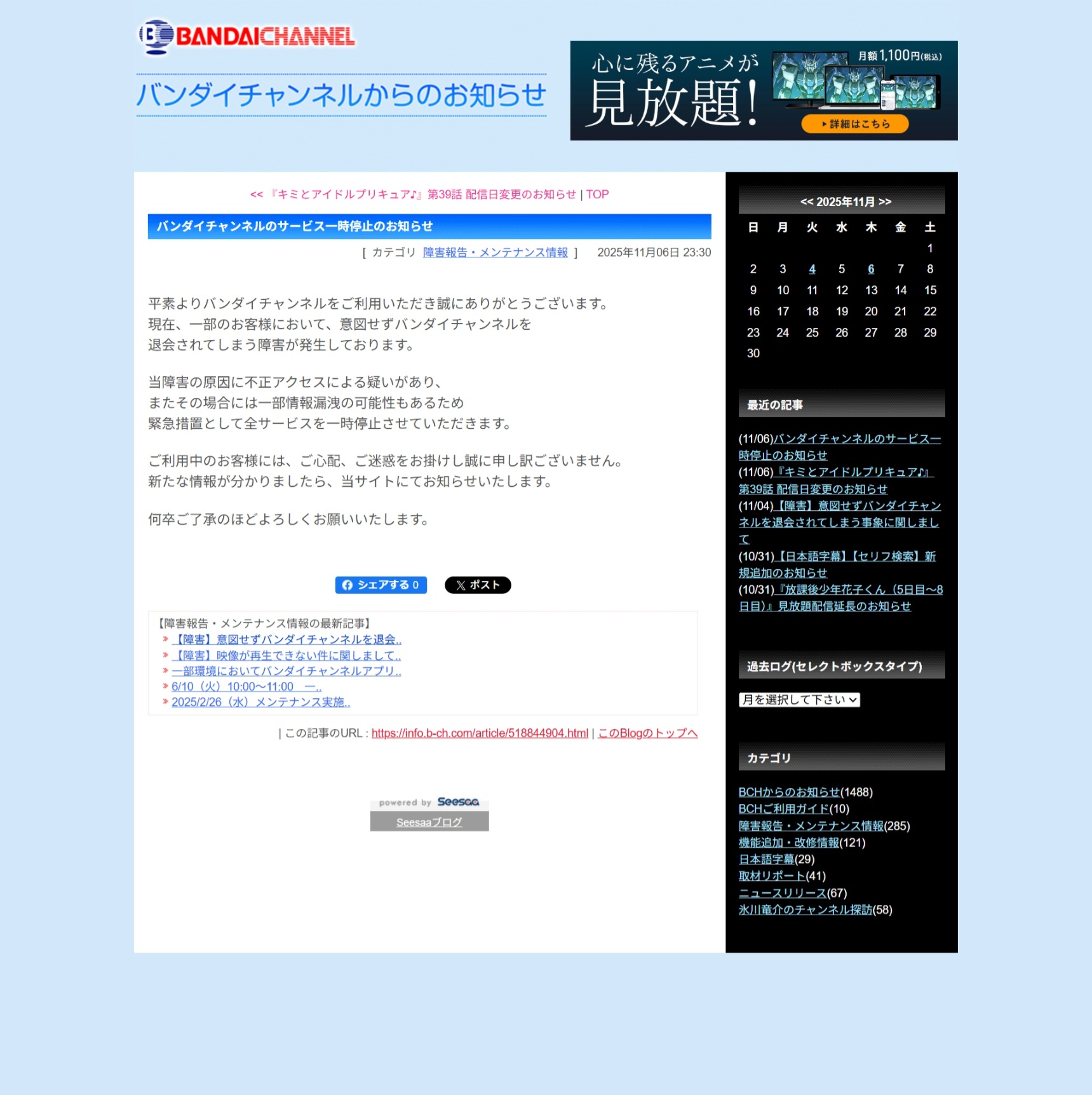 株式会社バンダイナムコフィルムワークスが運営する動画配信サービス「バンダイチャンネル」は、外部からの不正アクセスを受けた疑いがあるとして、現在すべてのサービスを一時停止しています。