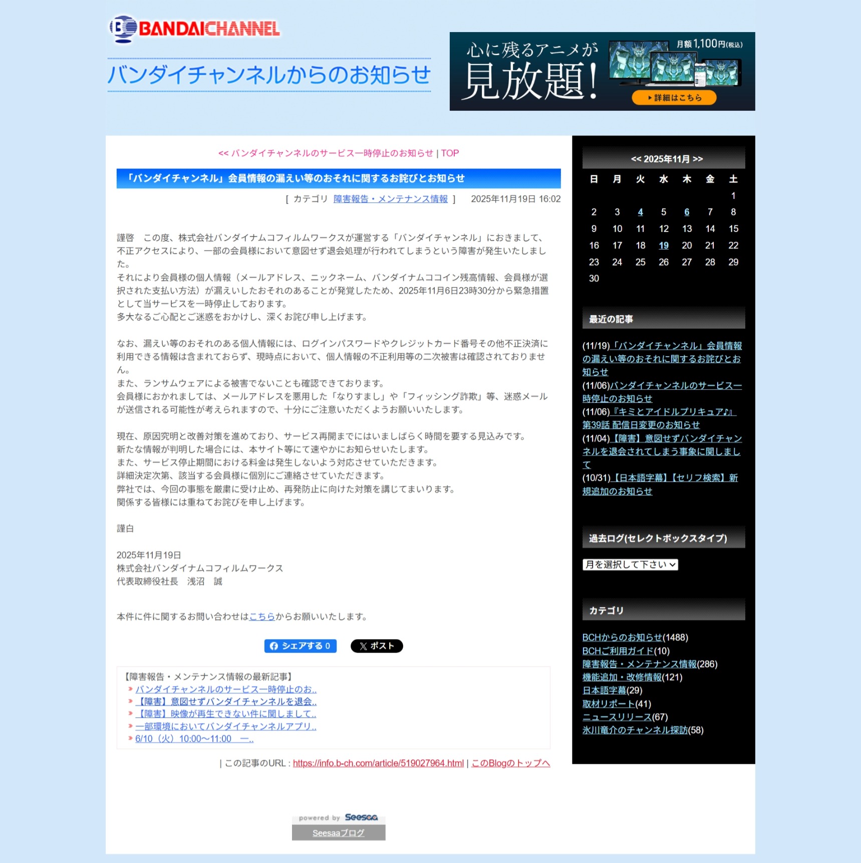 「バンダイチャンネル」会員情報の漏えい等のおそれに関するお詫びとお知らせ