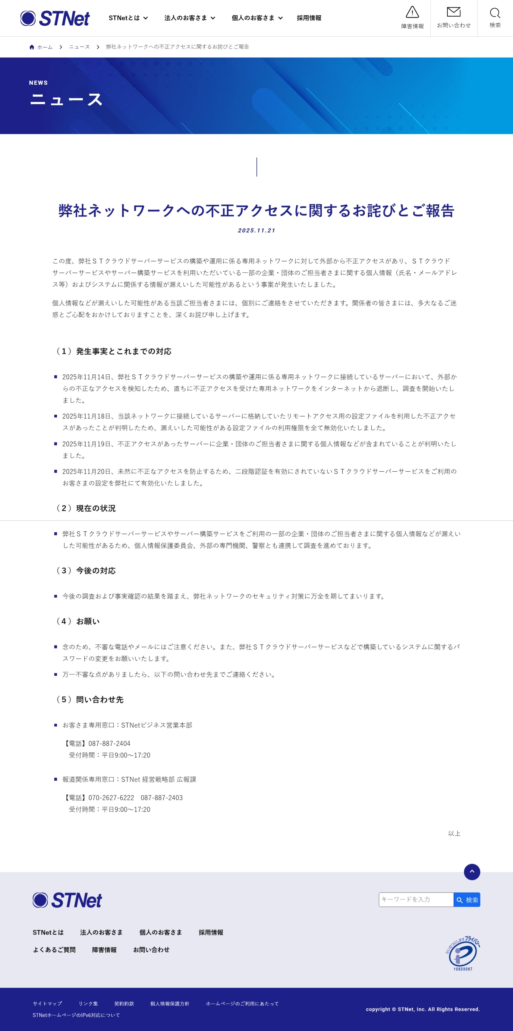 弊社ネットワークへの不正アクセスに関するお詫びとご報告 | ニュース | 株式会社STNet(エスティネット)