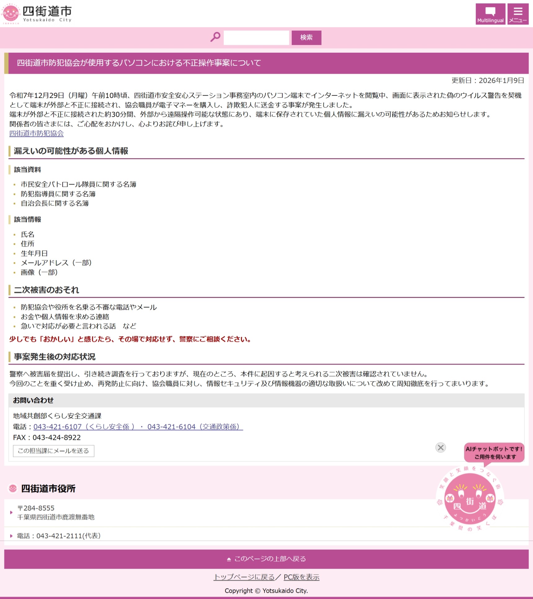 四街道市防犯協会が使用するパソコンにおける不正操作事案について 四街道市