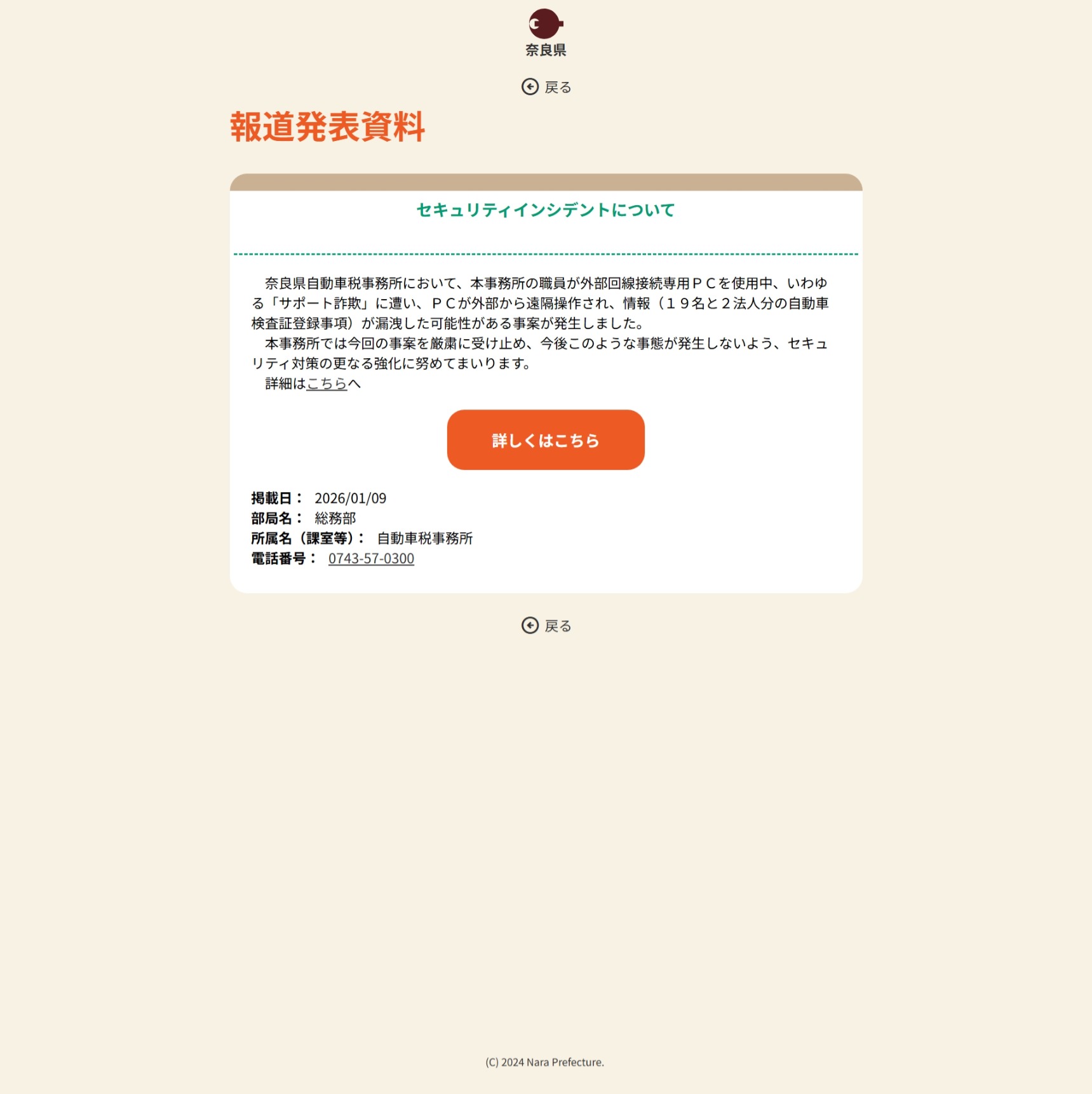 奈良県のお知らせによりますと、同県自動車税事務所において2025年12月18日、職員がインターネット閲覧用に独自導入していたパソコンを使用中、Microsoftを騙る「トロイの木馬に感染した」旨の偽警告が表示されました。職員は表示された電話番号に連絡し、指示されるまま遠隔操作ソフトをインストールしてしまったということです。 この操作により、当該パソコン内に保存されていた過去の調査履歴などから、19名および2法人分の自動車検査証登録事項(氏名、住所、車台番号など)が流出した可能性があります。県は、このパソコンが税情報を扱う基幹ネットワークからは物理的に切り離されていたとしていますが、独自調達パソコンの利用を原則禁止するなどセキュリティ対策を強化する方針です。