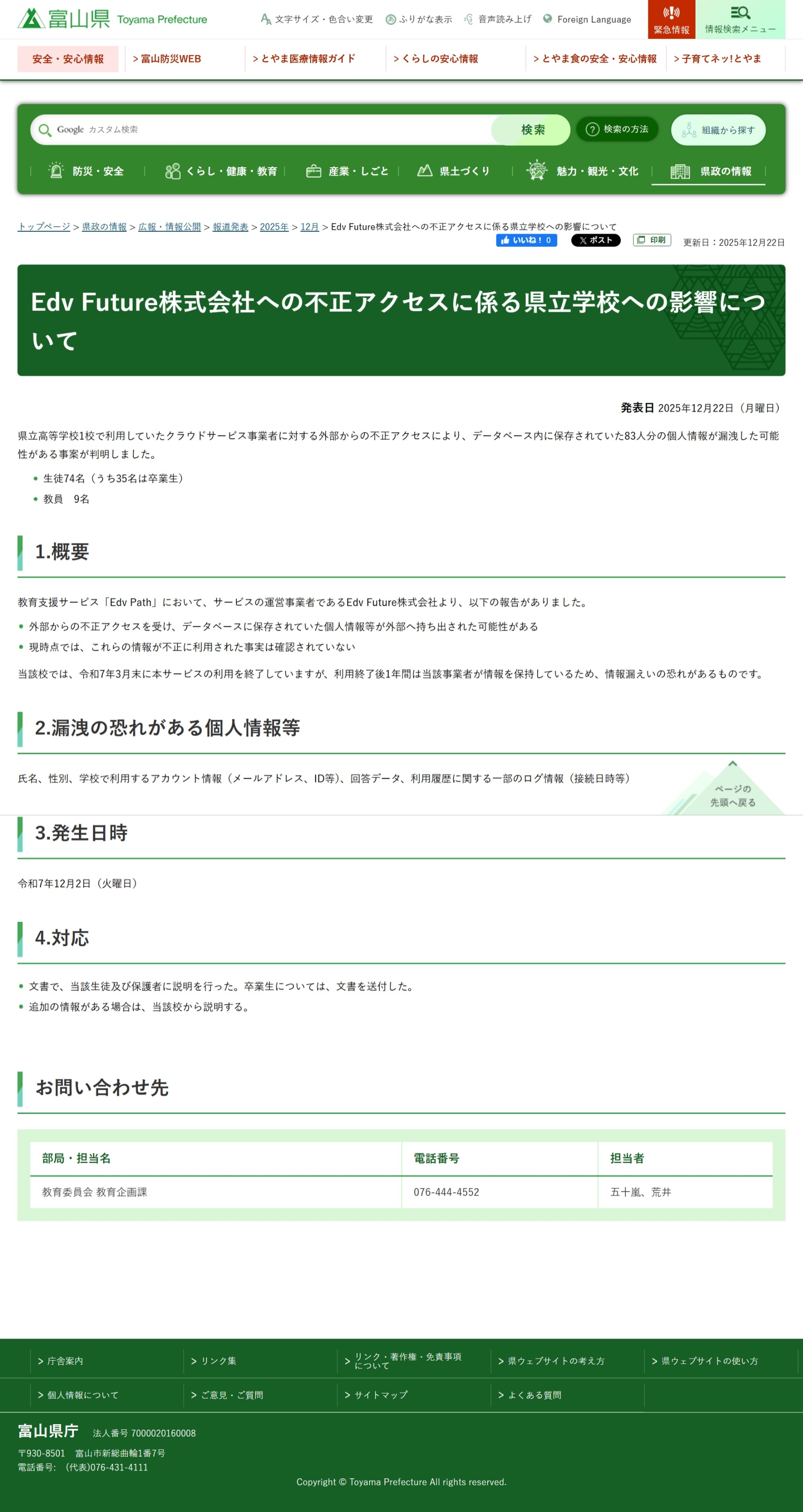 富山県は22日、県立高等学校1校において、生徒74名(うち35名は卒業生)、教員9名の、あわせて83名分の氏名、性別、学校利用アカウント情報、回答データ、ログ情報などの個人情報が流出した可能性があると発表しました。