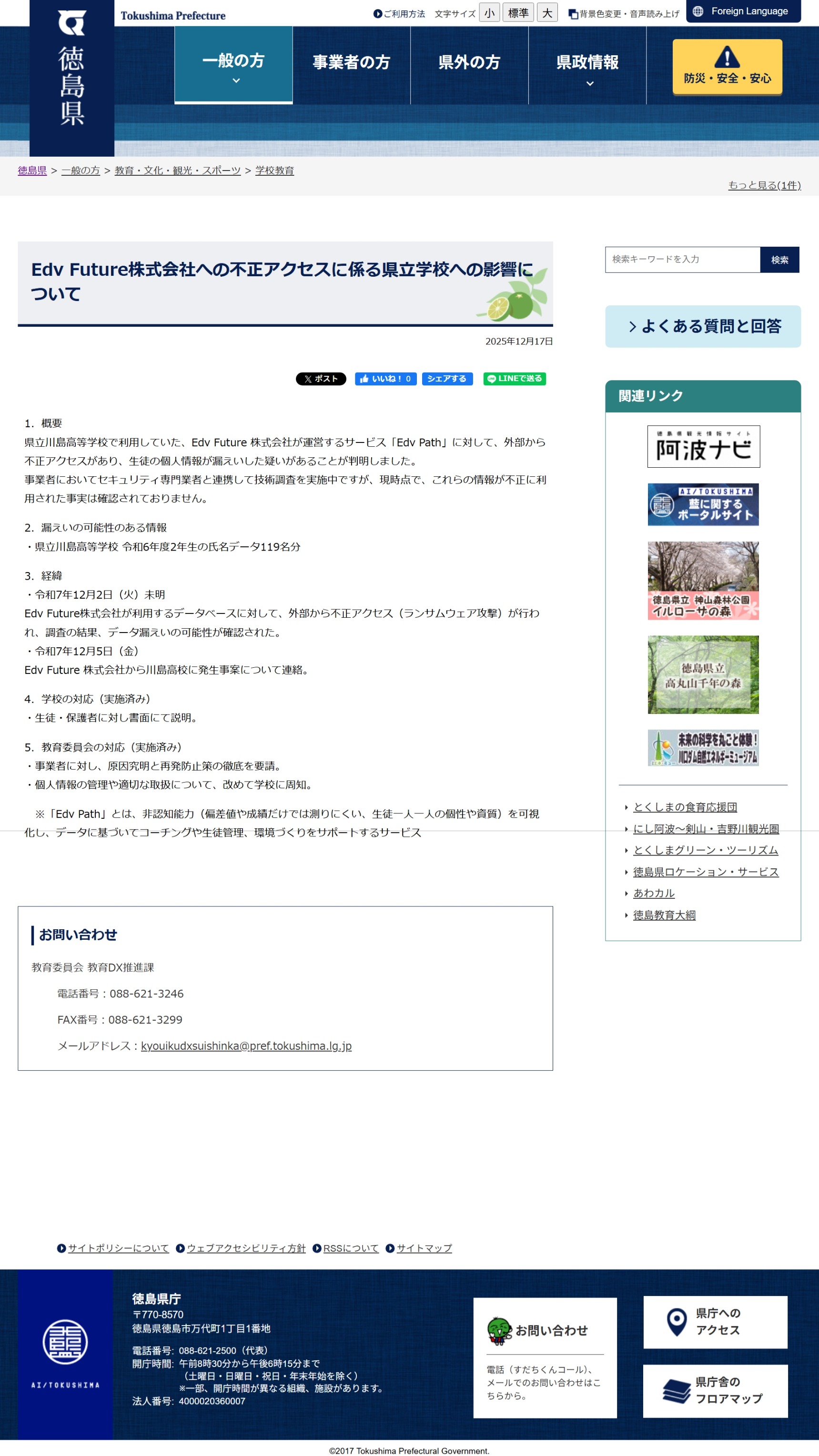 Edv Future株式会社への不正アクセスに係る県立学校への影響について|徳島県ホームページ