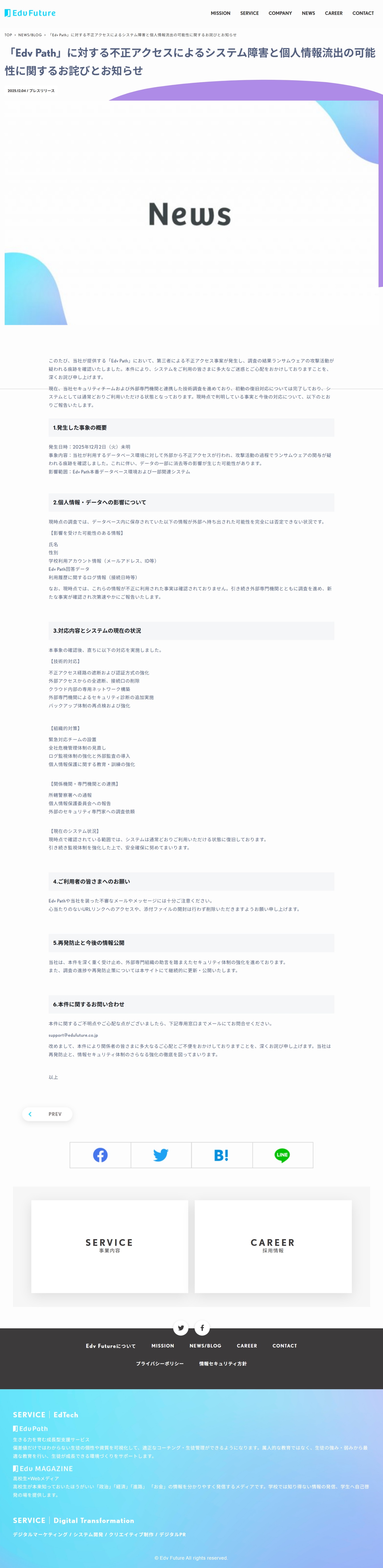 「Edv Path」に対する不正アクセスによるシステム障害と個人情報流出の可能性に関するお詫びとお知らせ | EdvFuture