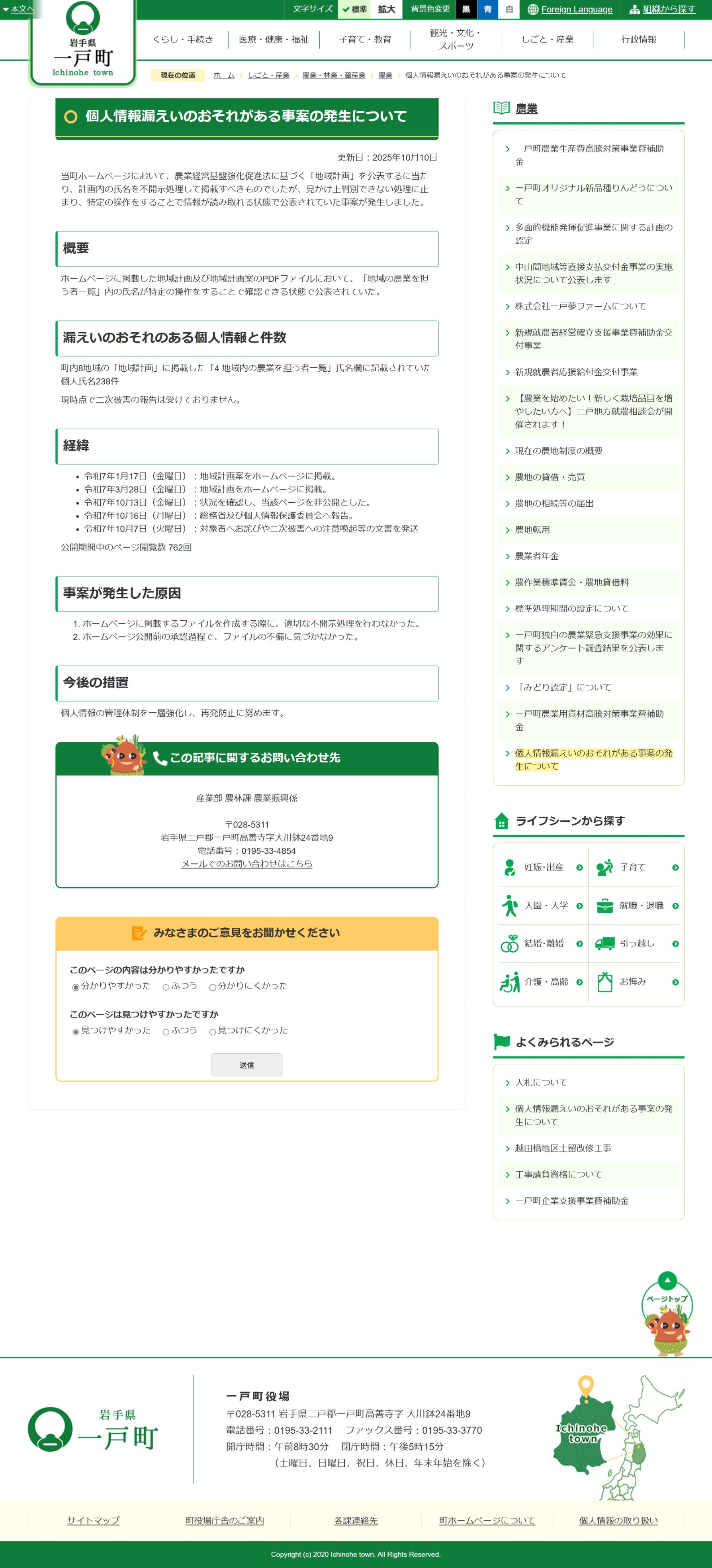 個人情報漏えいのおそれがある事案の発生について/一戸町事案の概要:岩手県一戸町は、農業経営基盤強化促進法に基づく地域計画をホームページ上で公表した際、計画内に記載された氏名の不開示処理が不十分であったため、特定の操作により個人情報が閲覧可能な状態で公開されていた事案が発生したと発表しました。漏えいの可能性があるのは町内8地域における「地域の農業を担う者一覧」に記載された238件の氏名で、現時点では二次被害の報告はないとのことです。町は10月3日に該当ページを非公開とし、6日には総務省および個人情報保護委員会へ報告、7日には対象者への謝罪と注意喚起を行いました。原因はファイル作成時の不適切な処理および公開前の確認不足であり、今後は個人情報管理体制の強化と再発防止に努めるとしています。