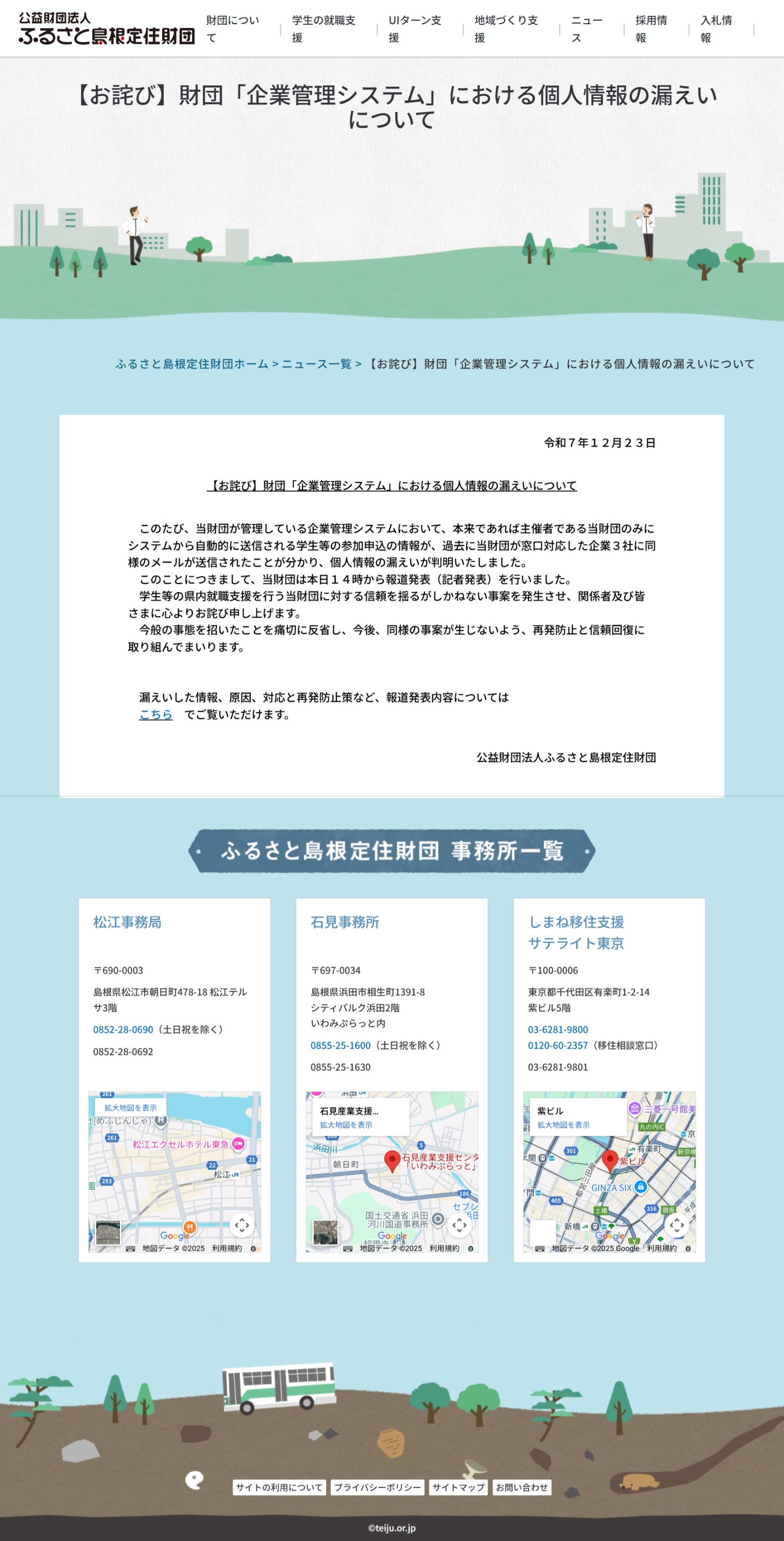 公益財団法人ふるさと島根定住財団(松江市)は12月23日、同財団が管理するシステムにおいて、就職イベントなどに参加を申し込んだ学生らの個人情報が、関係のない企業3社に誤ってメール送信されていたと発表しました。漏えいした情報は1,238人分に上ります。