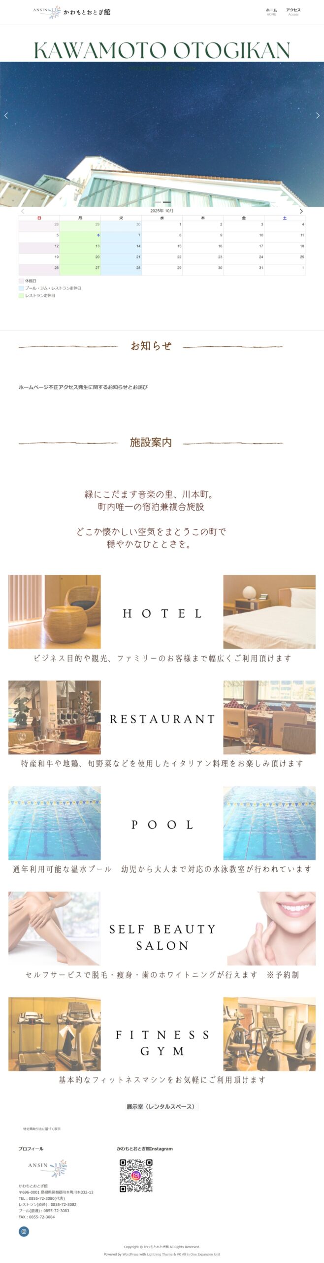 「かわもとおとぎ館」は、安伸有限会社が運営する複合施設で、ホテル、レストラン、室内温水プール、トレーニングジム、カラオケ、セルフエステといった様々な施設が一つの建物内に集約されています。