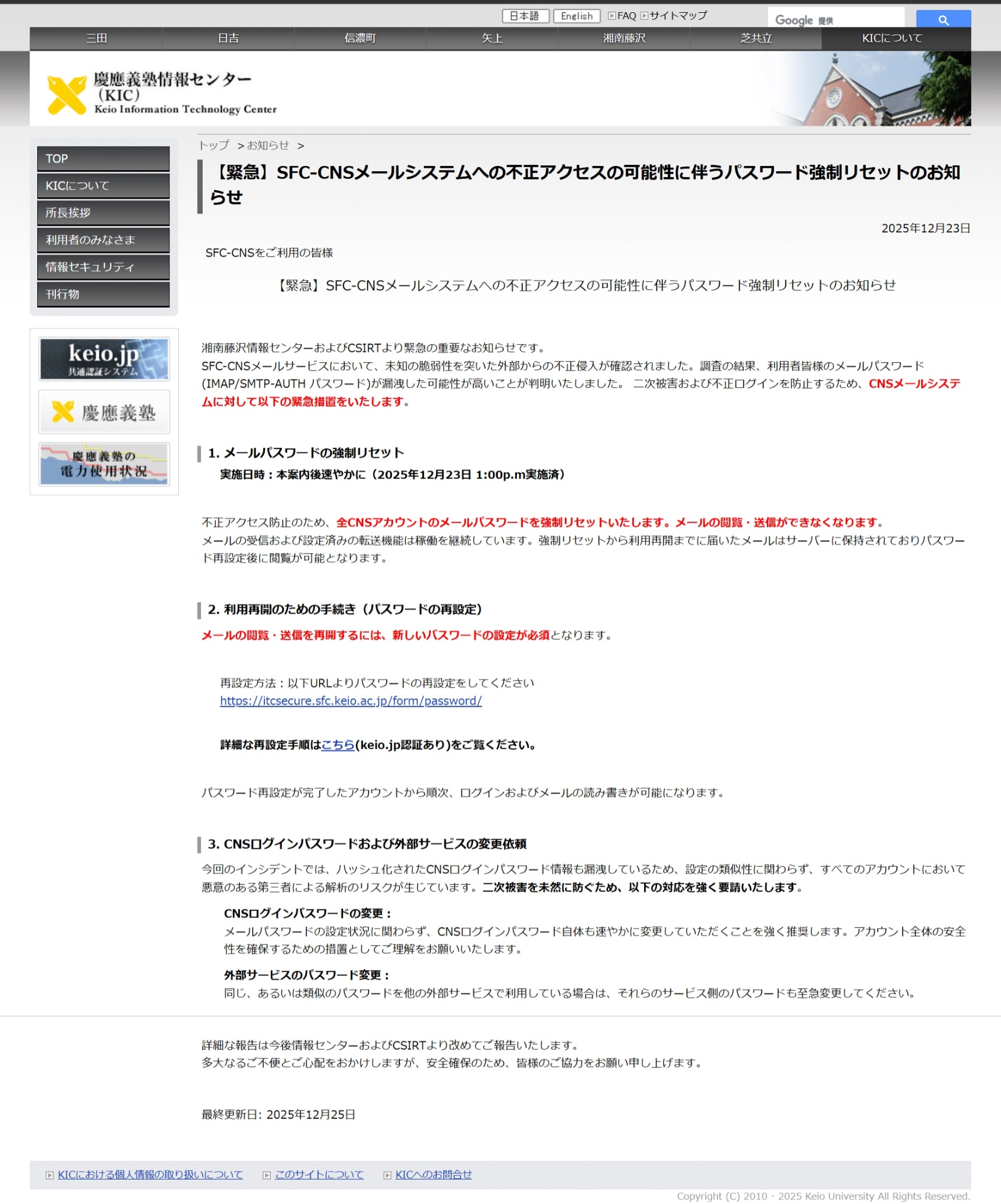 慶應義塾大学湘南藤沢情報センター(SFC-ITC)は2025年12月25日、同キャンパスのコンピュータネットワークシステム(SFC-CNS)において外部からの不正アクセスが確認されたことを受け、全利用者のログインパスワードを強制的にリセットしたと発表しました。
