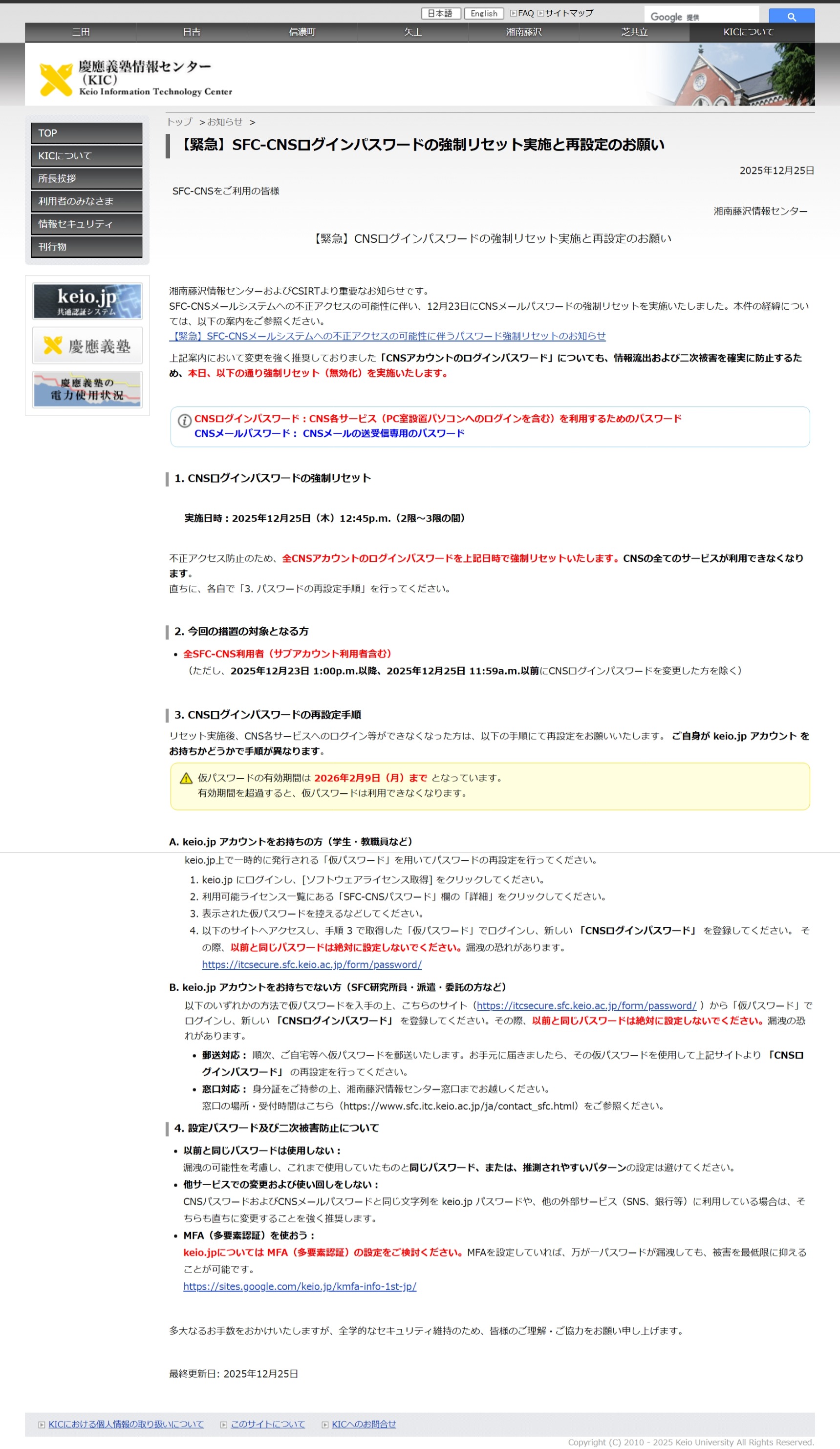 【緊急】SFC-CNSメールシステムへの不正アクセスの可能性に伴うパスワード強制リセットのお知らせ | 慶應義塾ITC